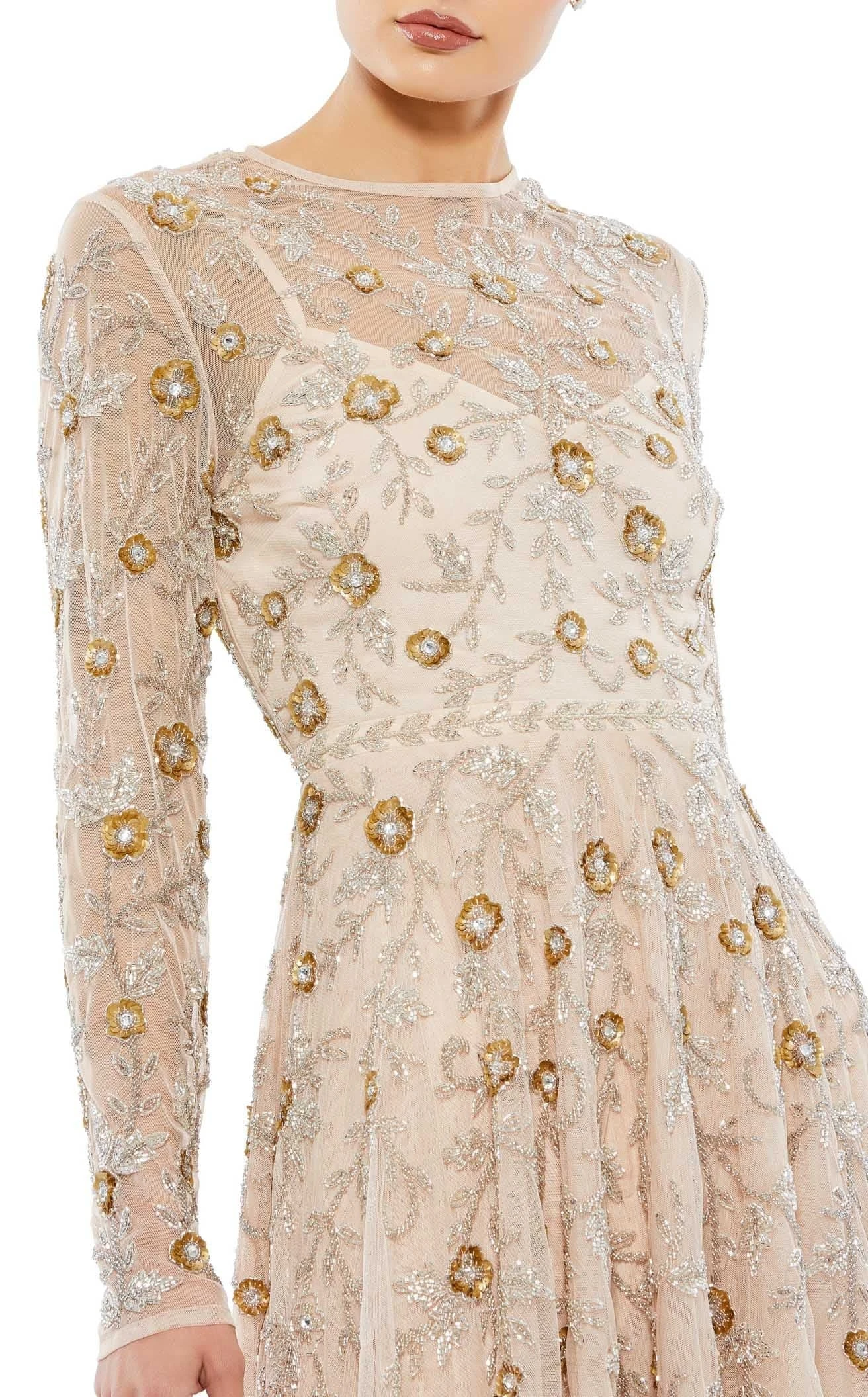 Sheer High Neckline Sequin Embroidered Midi Dress by Mac Duggal