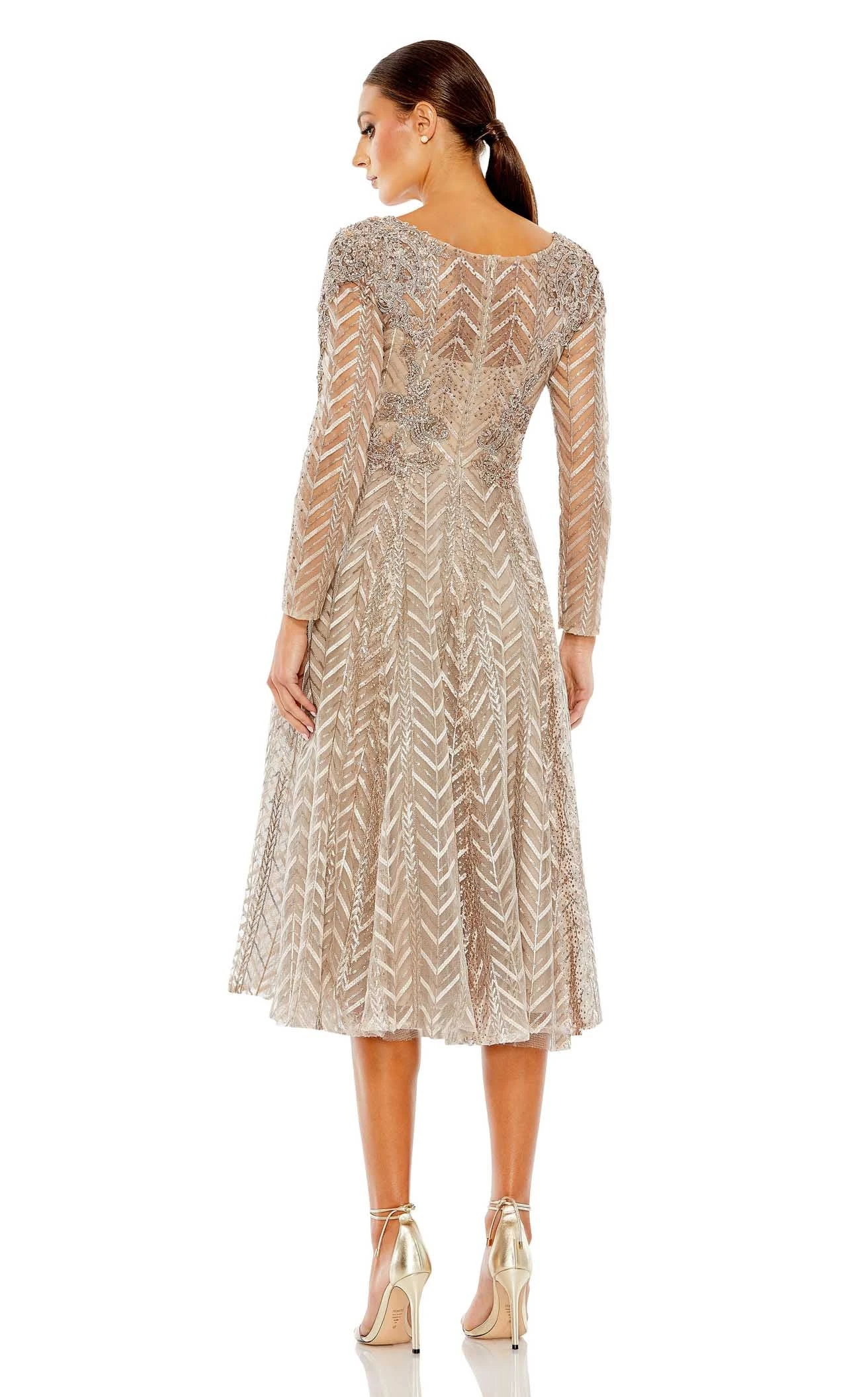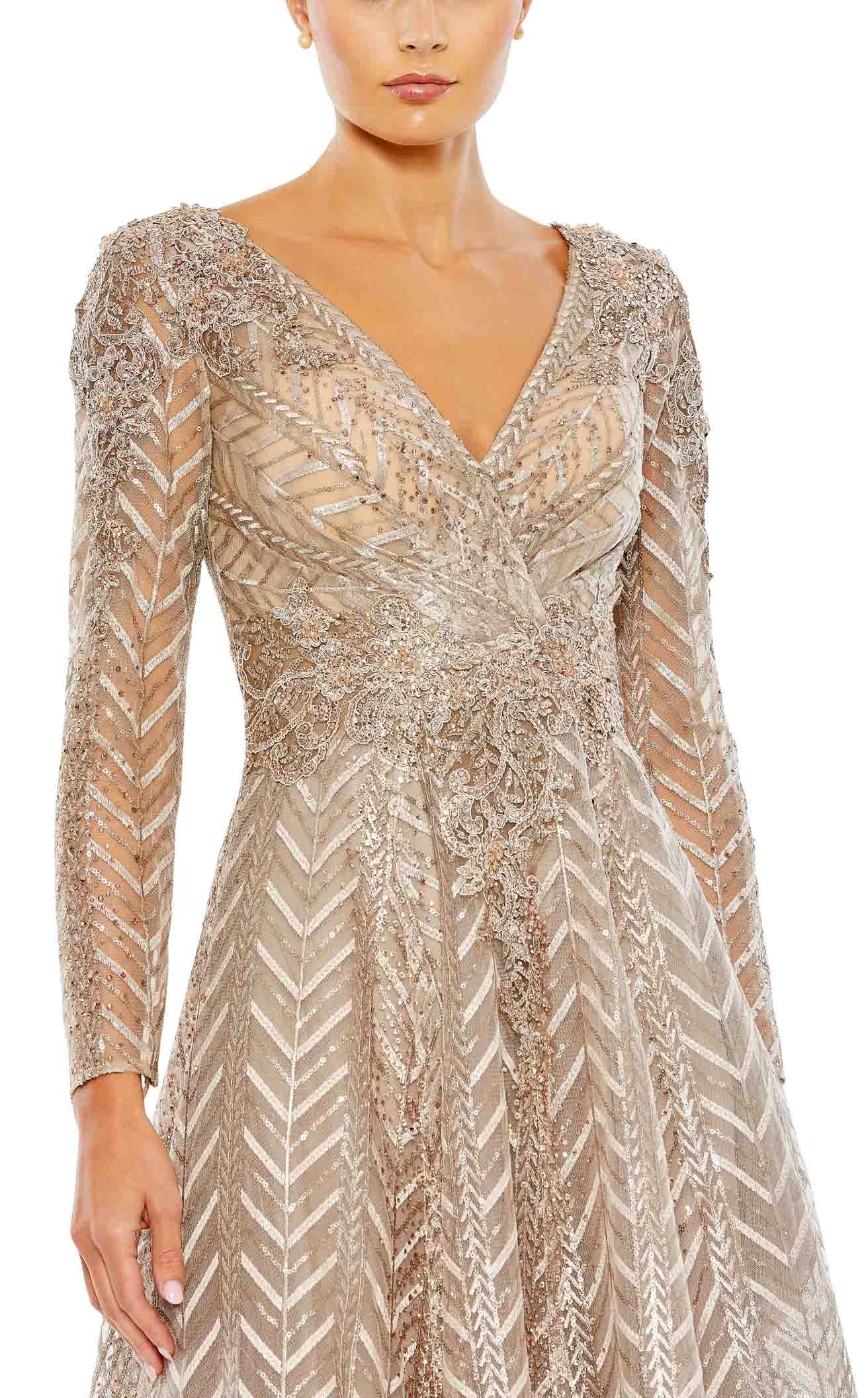 Flaunt your charming sense of fashion by wearing this elegant fir from the house of Mac Duggal 20399. Graced with a chic V-neckline and long sheer sleeves, this captivating dress is festooned with intricate embroidered details and sequin embellishments. The midi-length skirt is captured in an A-line silhouette to bring that dramatic touch to your style.