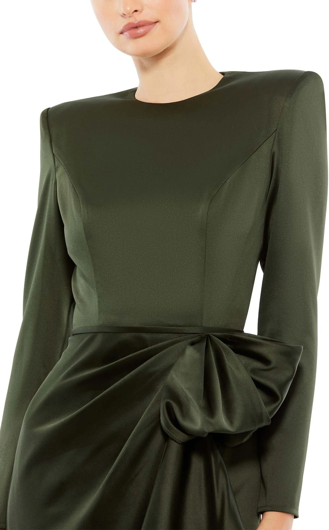 Be ready to stun everyone around you with your glamorous looks in this beautiful dress designed by Mac Duggal. The long dress has a modest round neckline and full-length sleeves with shoulder pads. The waist is cinched with bow detail. Extending from the waist is a floor-length sheath silhouette boasting a bold slit. This is a wonderful solid-patterned satin dress that looks sexy overall.