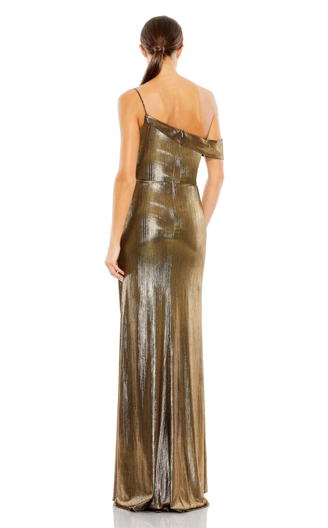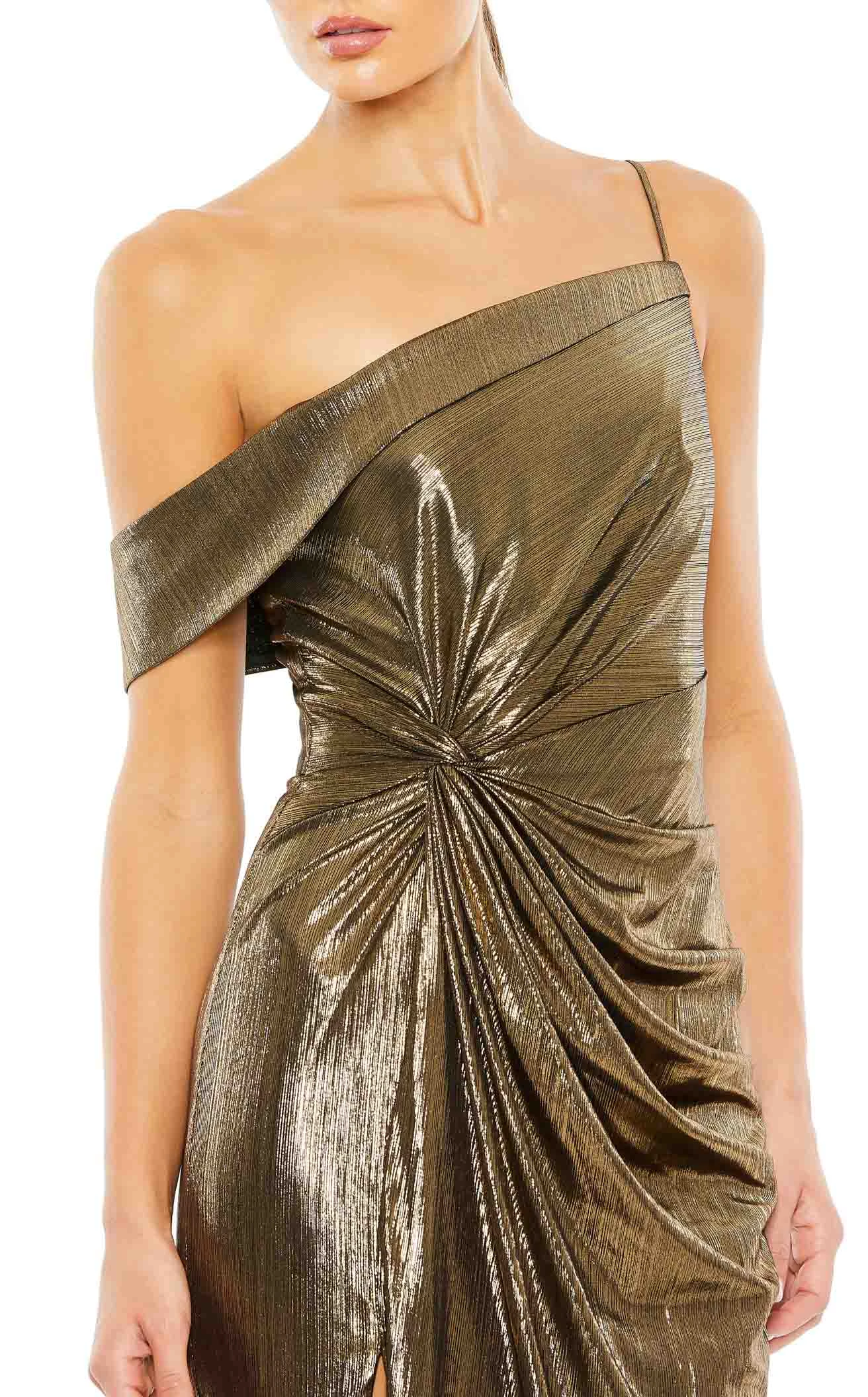 Asymmetrical Neckline One Sided Off Shoulder Ruching Detail Slit Dress by Mac Duggal