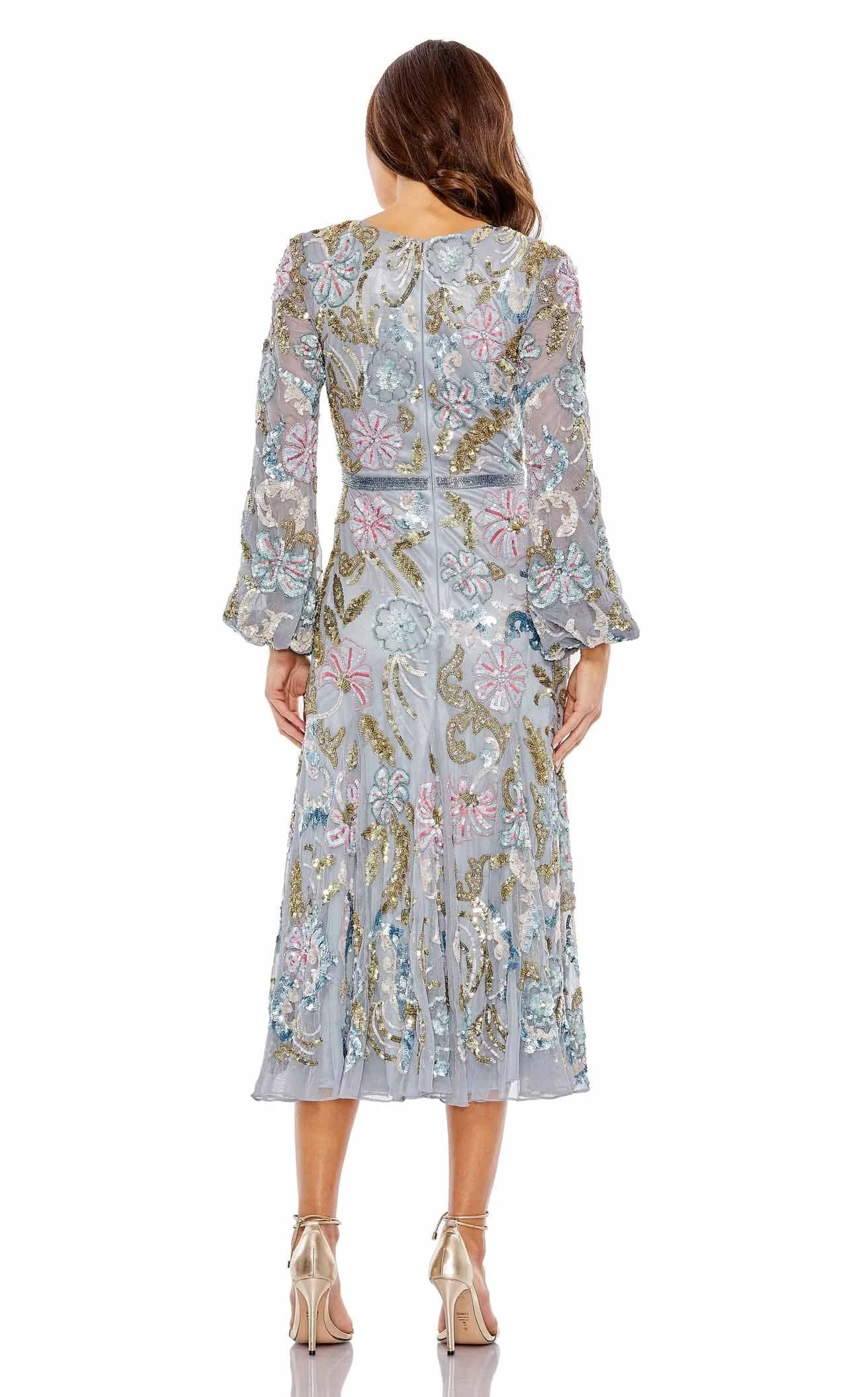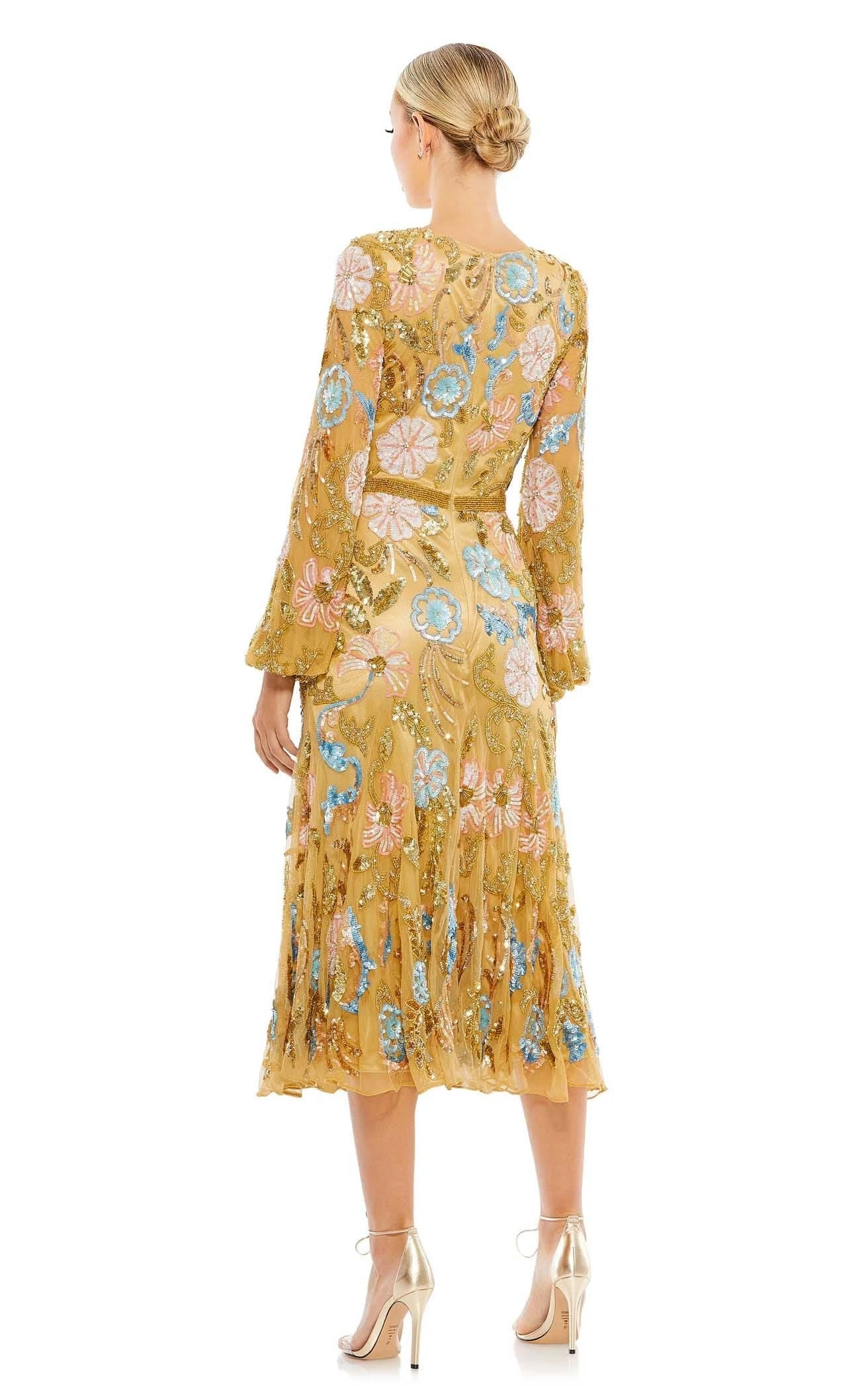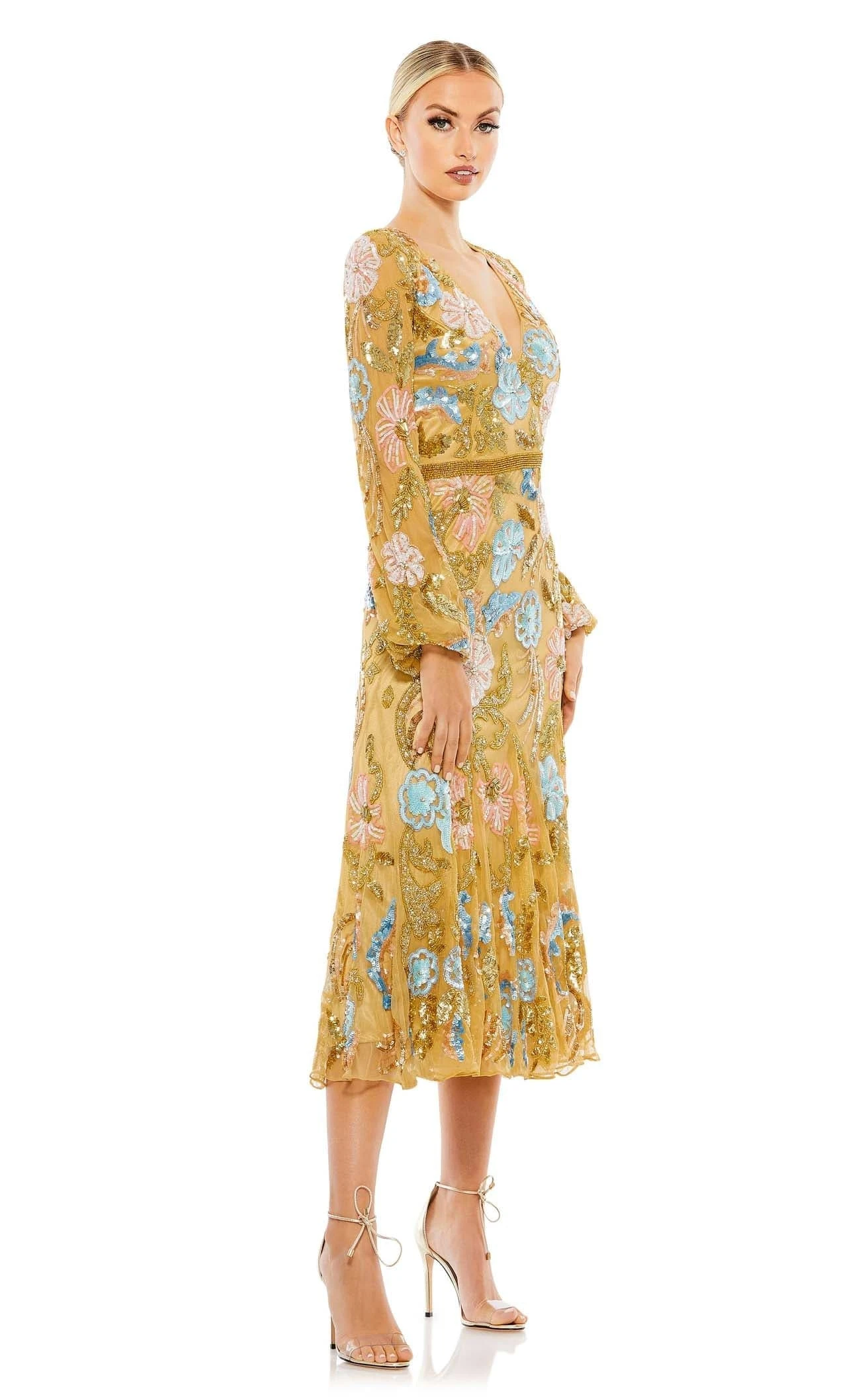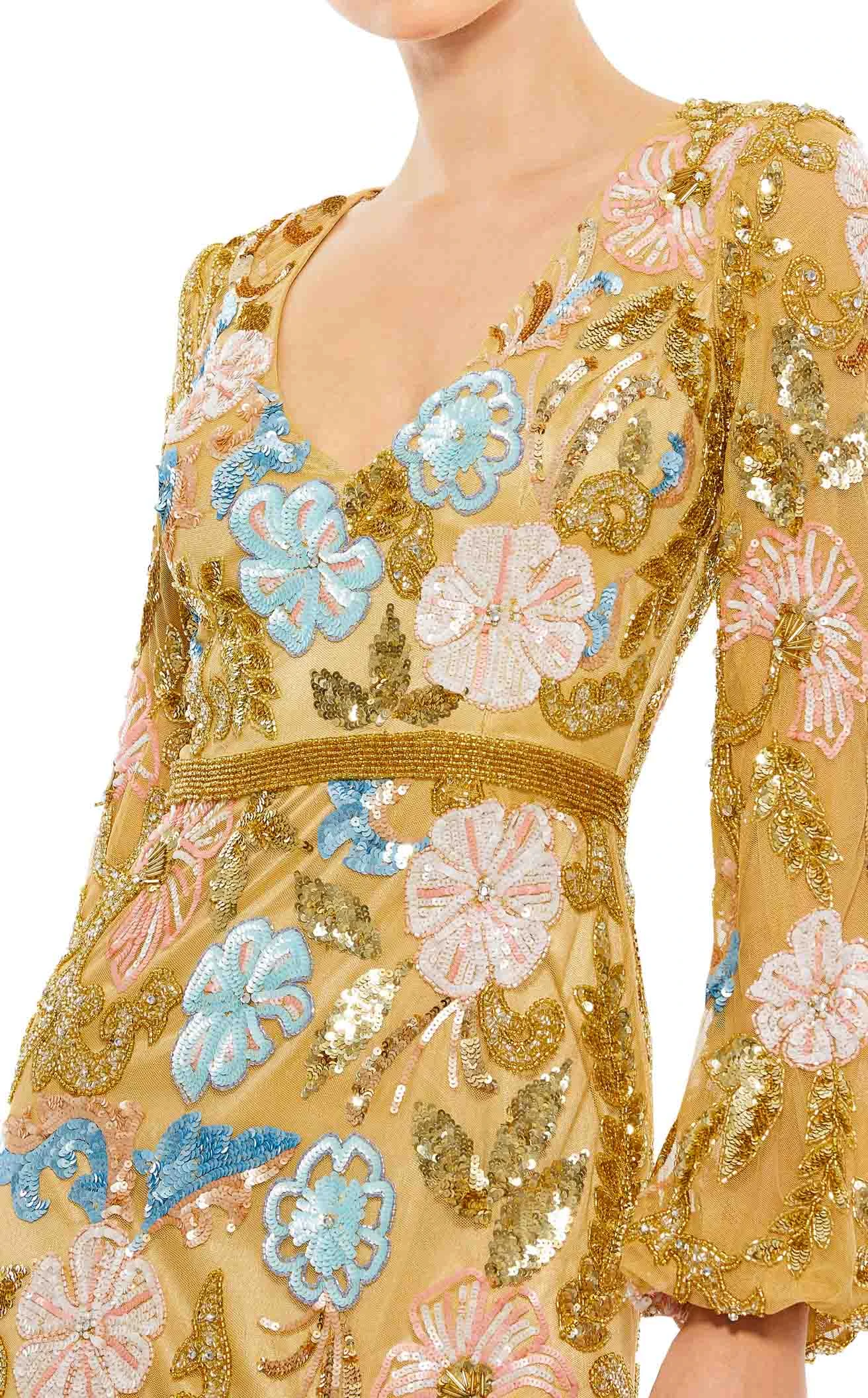 Doll up for the event in this mesmerizing dress by Mac Duggal. It flatters your neckline with a deep V-cut. The bishop sleeves and a natural waistline with an embellished belt will make you shine. This dress with floral appliques running throughout the silhouette is a red-carpet choice. It ends with an A-line pleated skirt around the knees.