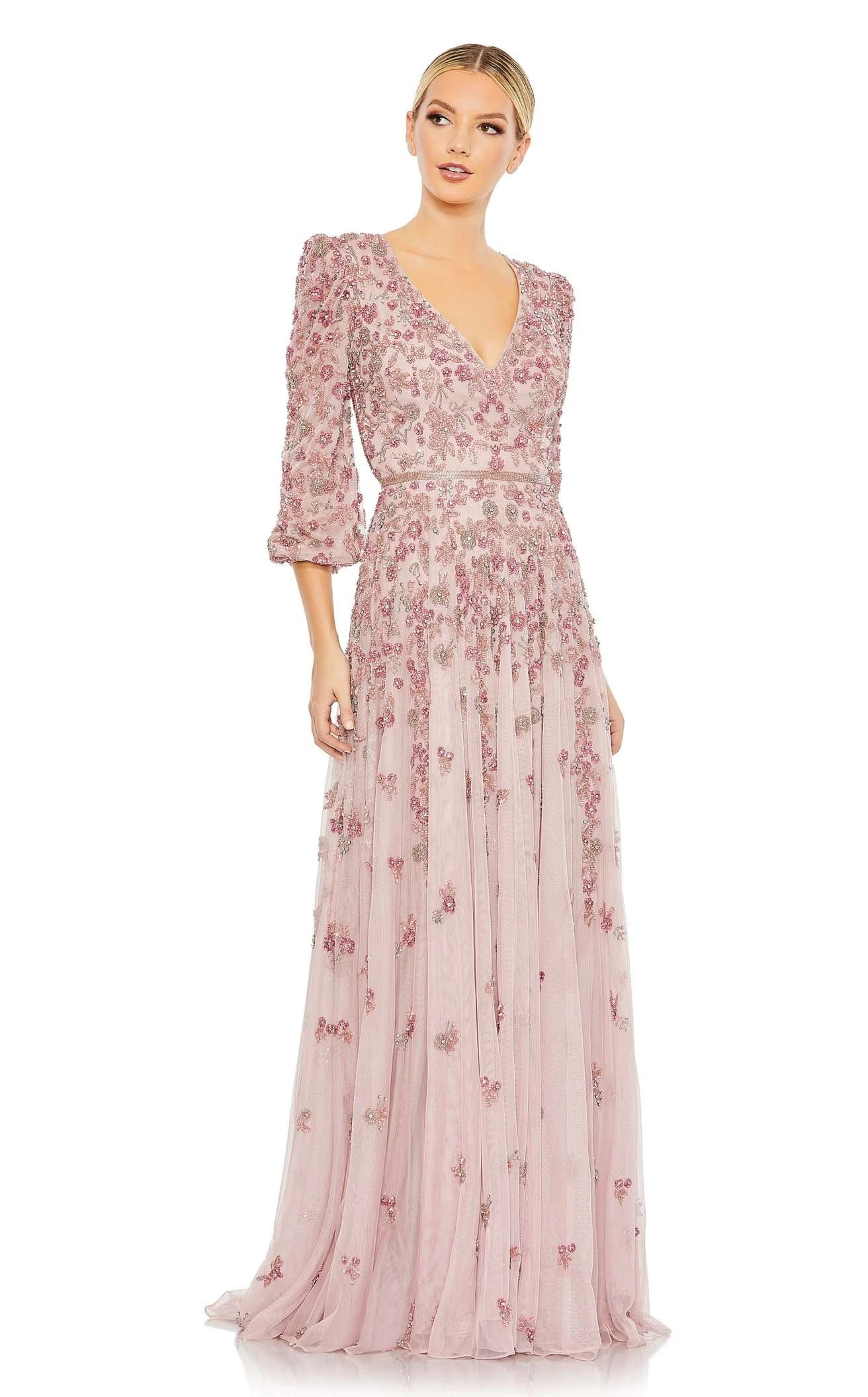 Don a queenly look in this full-length dress by Mac Duggal. It has a V-neckline with quarter puff sleeves. The natural waistline has a thin embellished band for a cinched look while the sheath skirt flaunts beautiful mesh pleats. Covered in sequins and glitters, this fashionable dress is a therapy in itself.