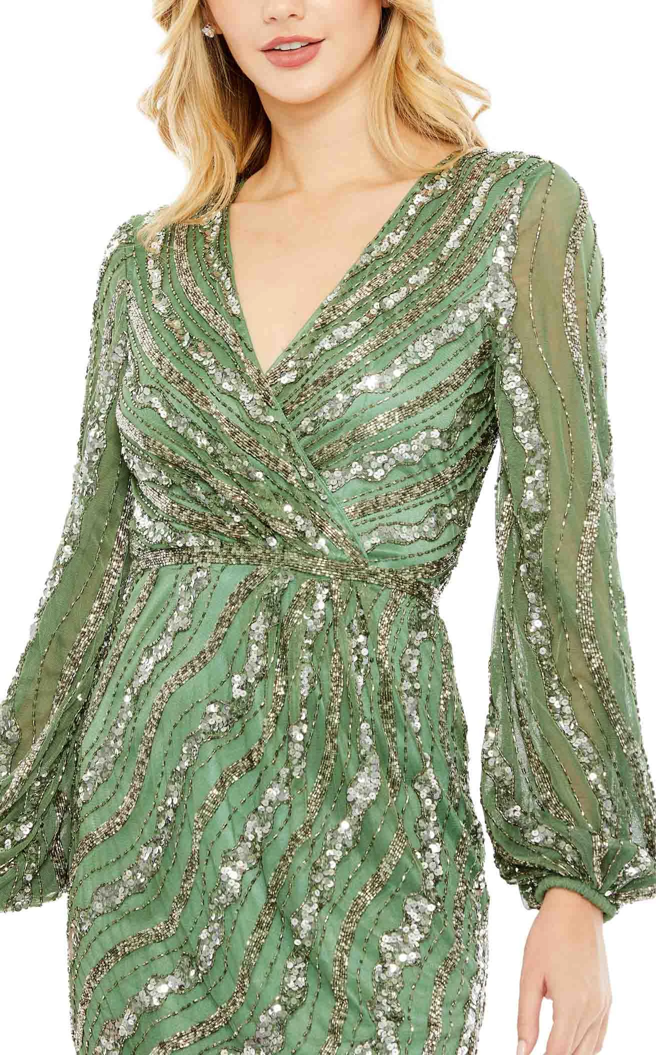Don a chic look with this Mac Duggal 5573 masterpiece. It has a wrap-over bodice with a V-neckline and bishop mesh sleeves. The natural waistline has an embellished belt and cascades into a sheath midi skirt. Garnered with sequins and glitters, the dress radiates shine all the time. It pairs well with gladiators and a bling clutch.