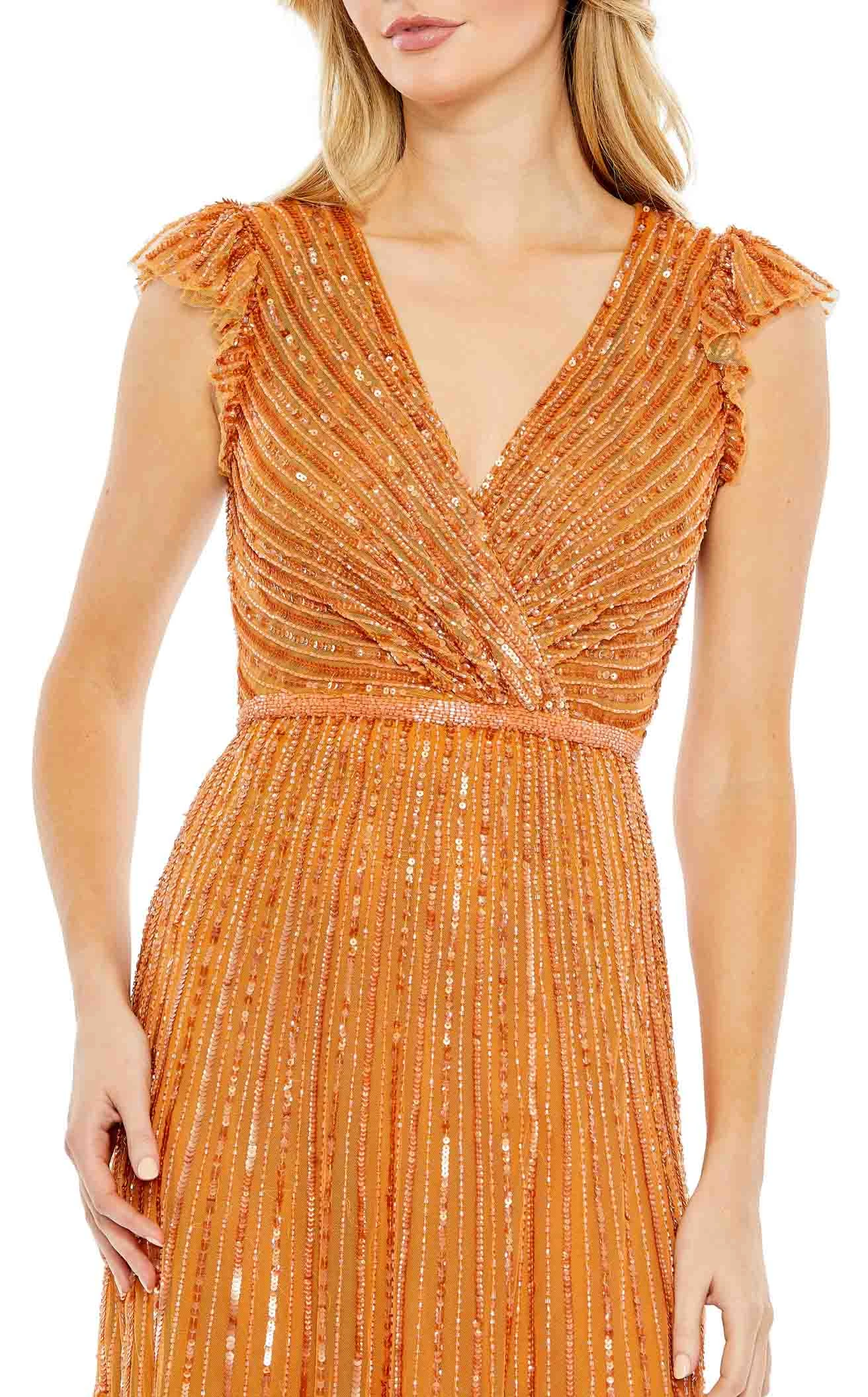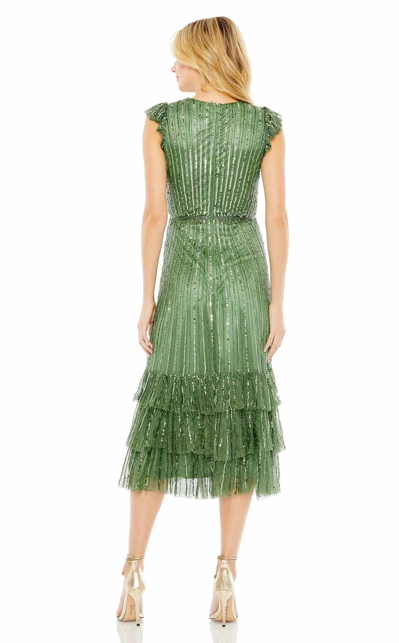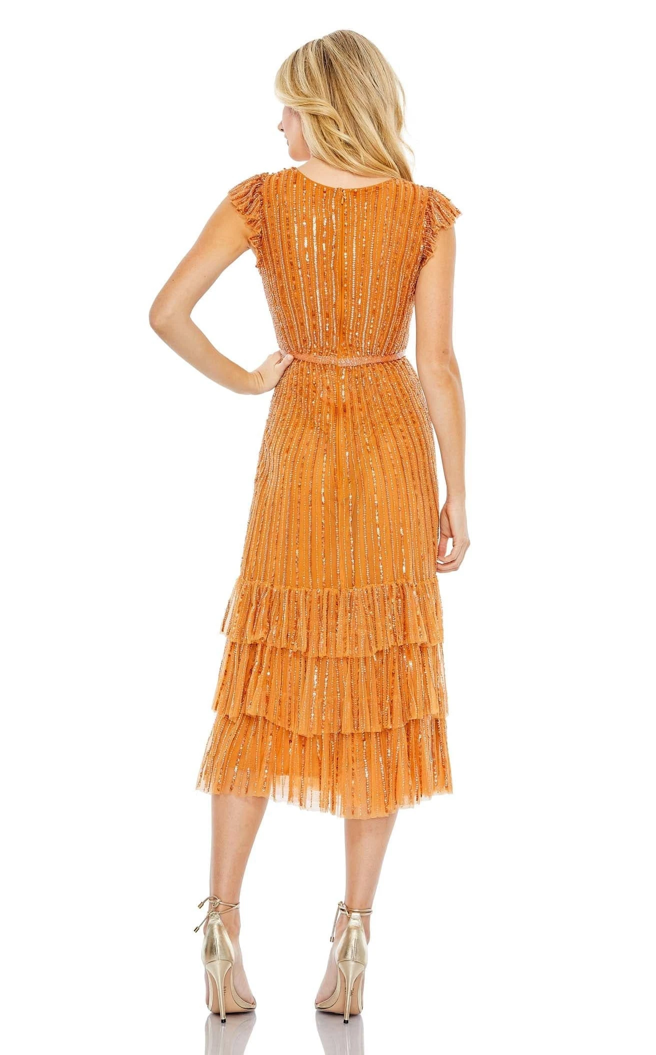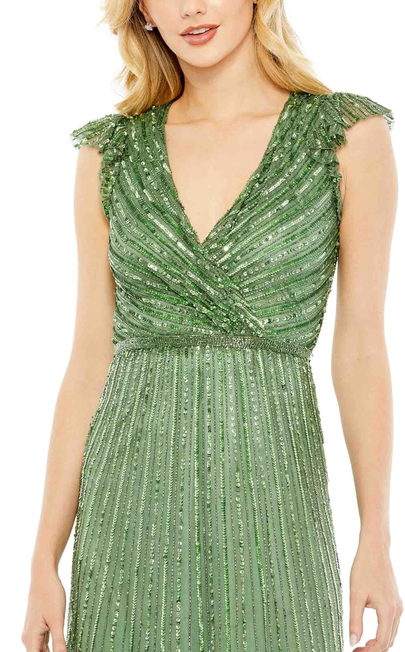 V-neckline Flutter Sleeve Beaded Waistband Ruffle Midi Skirt Dress by Mac Duggal