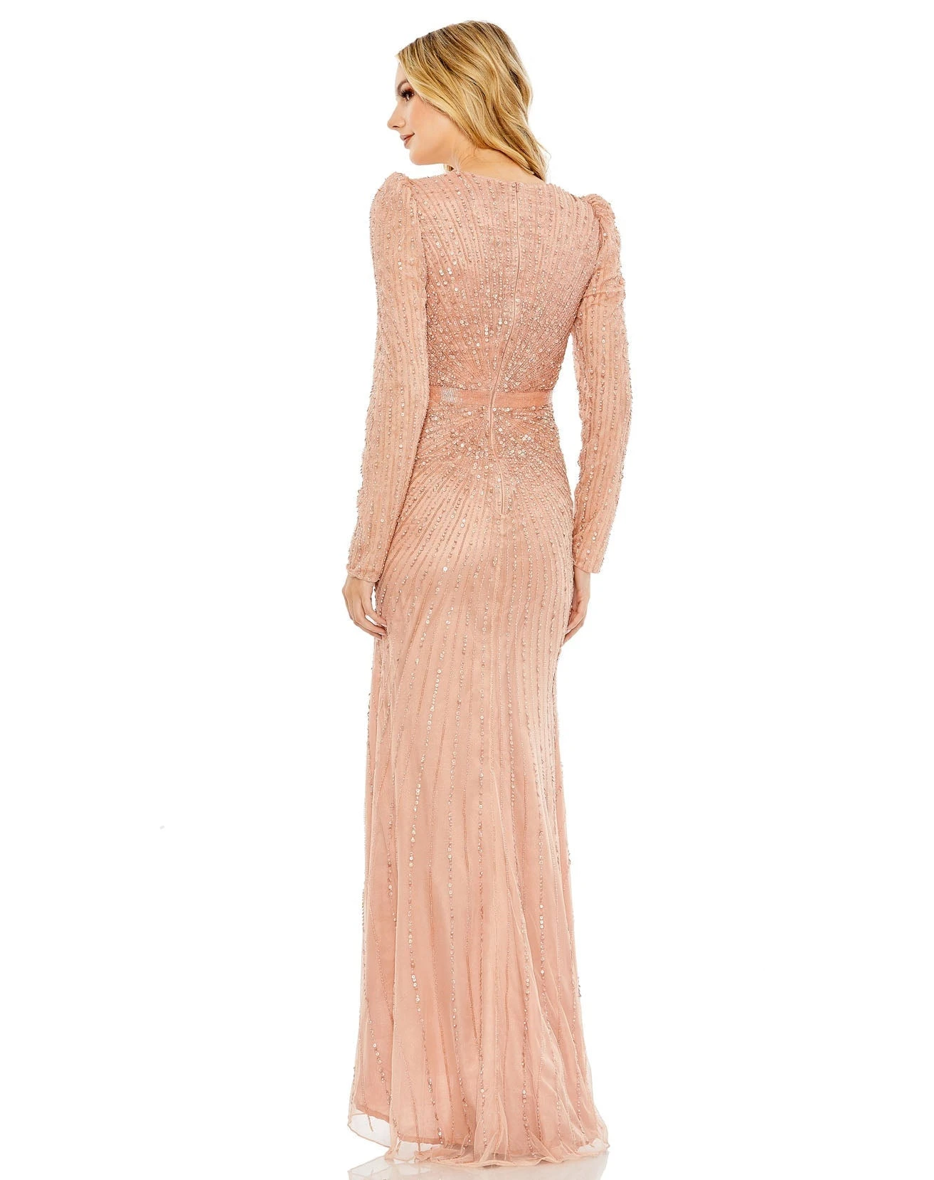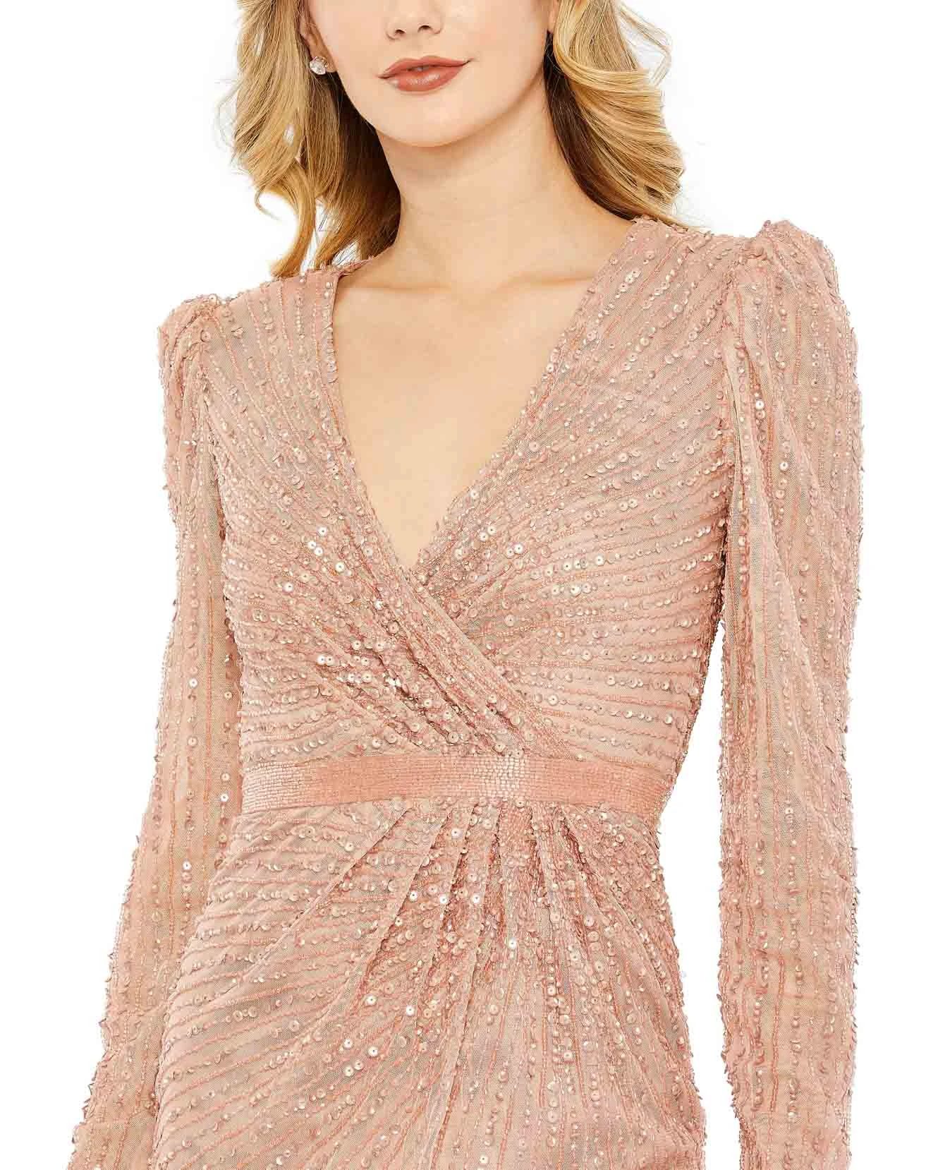 Look impressive at your next formal event in this dress by Mac Duggal 5715. Sequins and glitters create a waterfall effect on your silhouette and drop into an A-line style. It has a V-neckline with puffed full-length sleeves and a zippered back. The waistline has a fabric belt and drops into a sheath skirt.