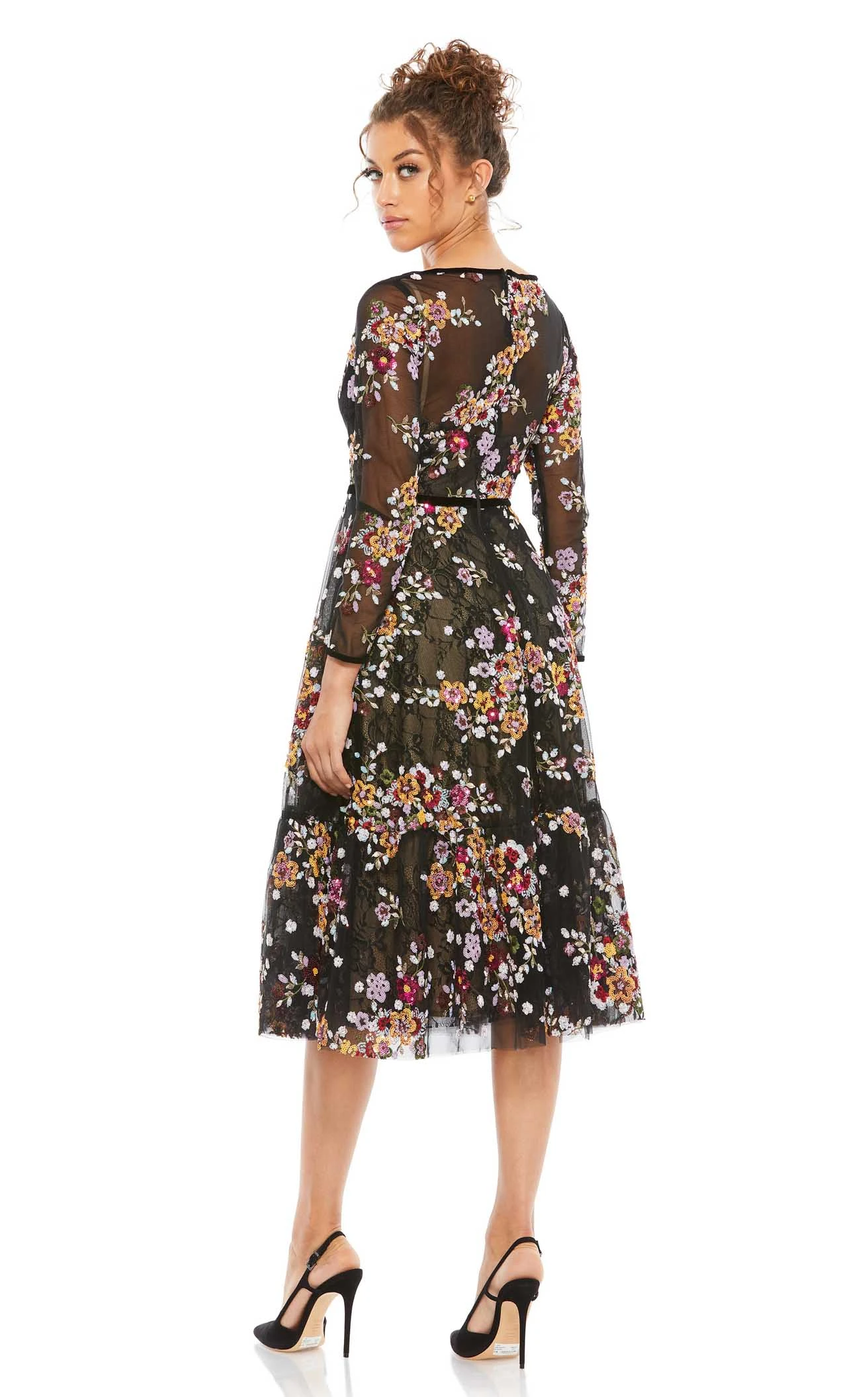 Mac Duggal has created this figure-flattering dress for important dates. It has a V-neck and an illusion zippered back supported by sheer long sleeves. The A-line silhouette is flourished with multi-colored embroidery and has a natural waistline for a petite figure. This tea-length dress can be paired with sling-back heels.