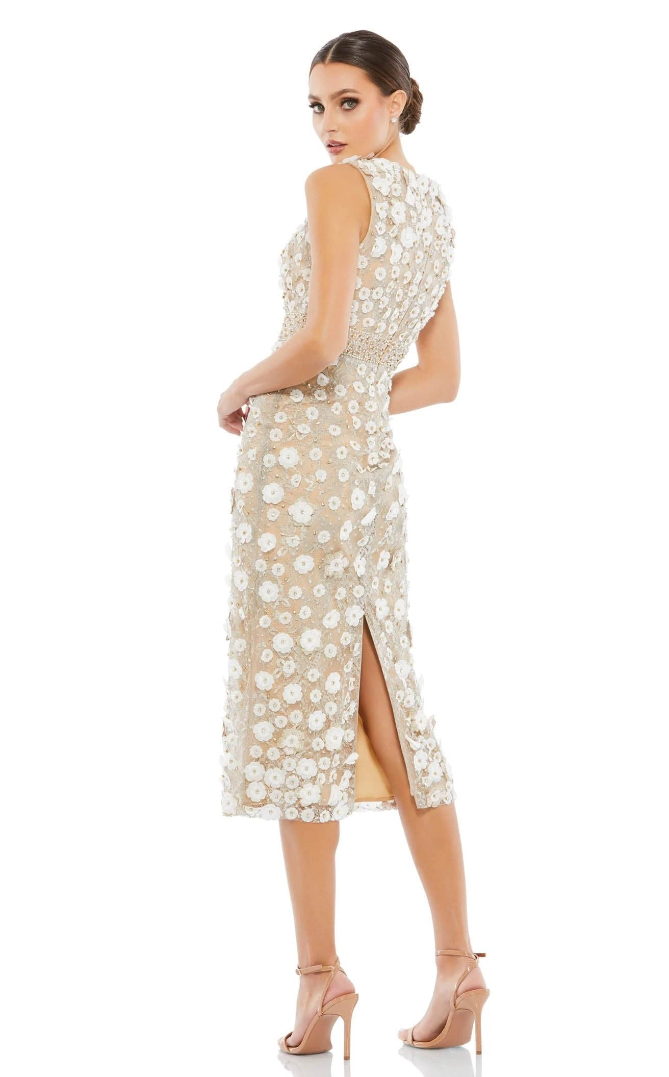A trendsetting choice for you, the dress by Mac Duggal is designed with love and care. Its perfectly sewn seams and a natural waistline hug your body in the right places. The sleeveless outfit is enveloped in floral appliques while the waistband is bead-embellished. It has a jewel neckline, a closed back, and a center slit cut at the back.