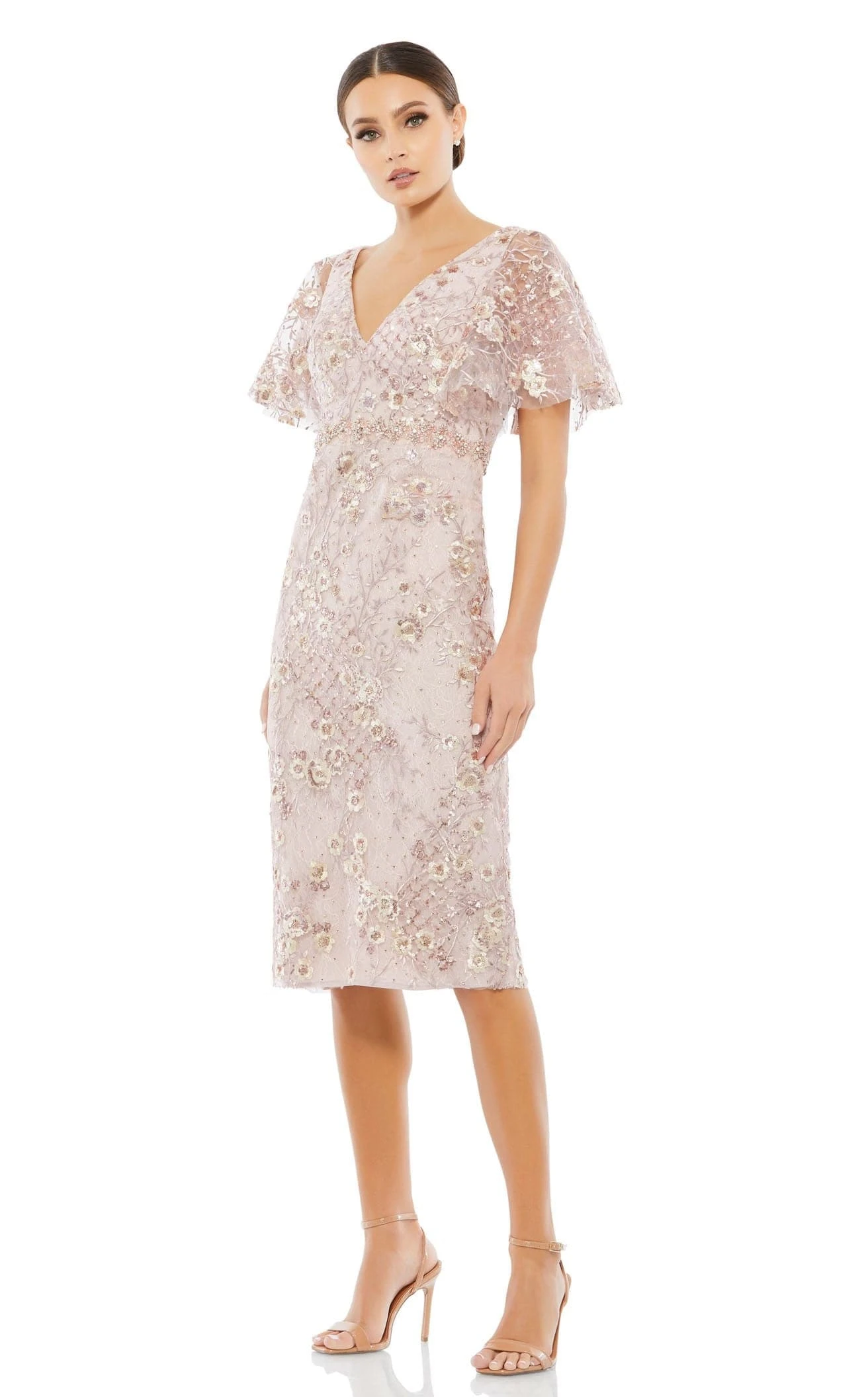 Enter the hall of fame wearing this graceful creation from Mac Duggal. The dress has a V-neck, flutter mesh sleeves, and a closed back. Covered in shimmering sequins, lace, and floral embroidery, the dress is a perfect choice for any event. It has a sheath silhouette that ends at a tea length with a slit at the center of the back.