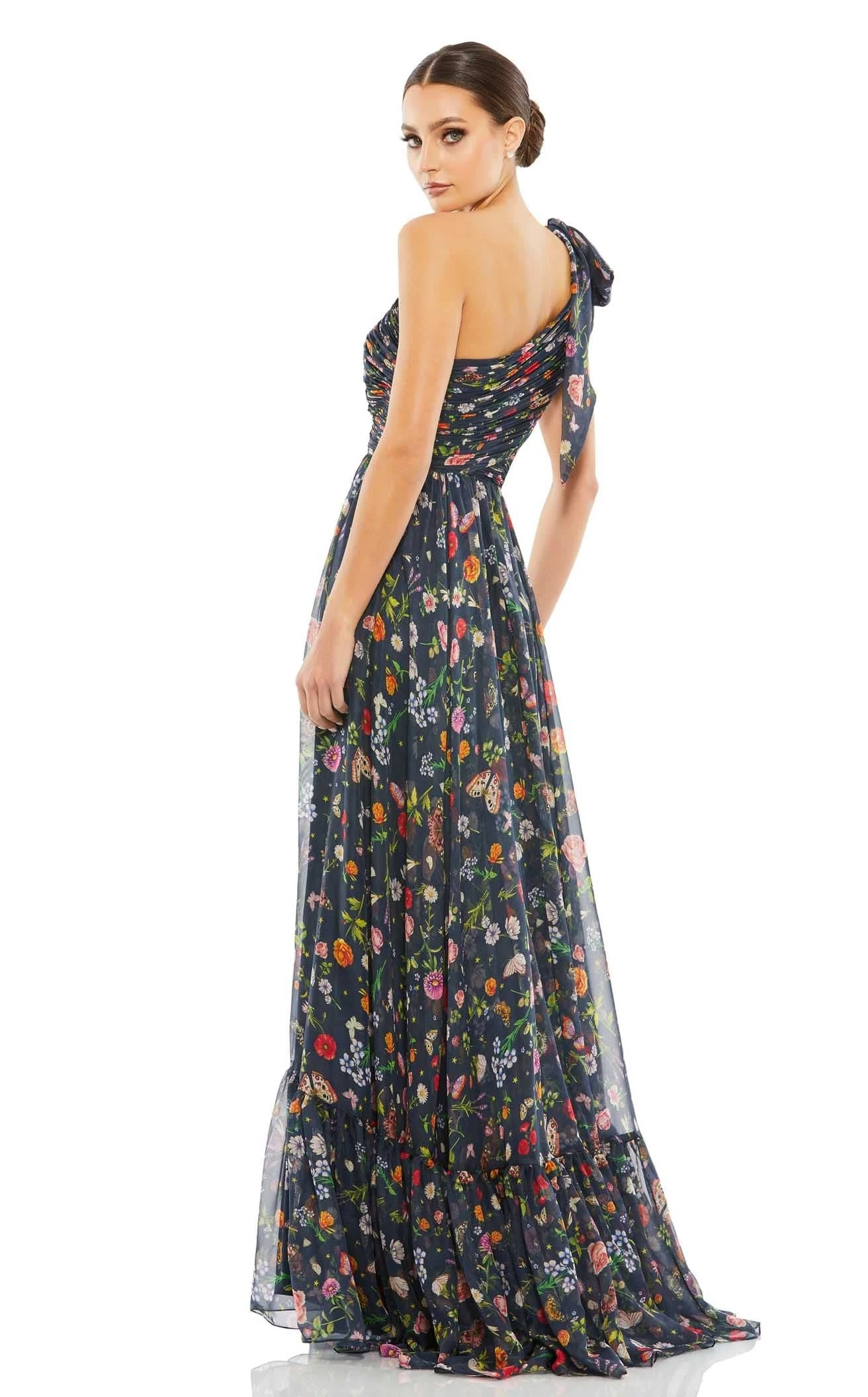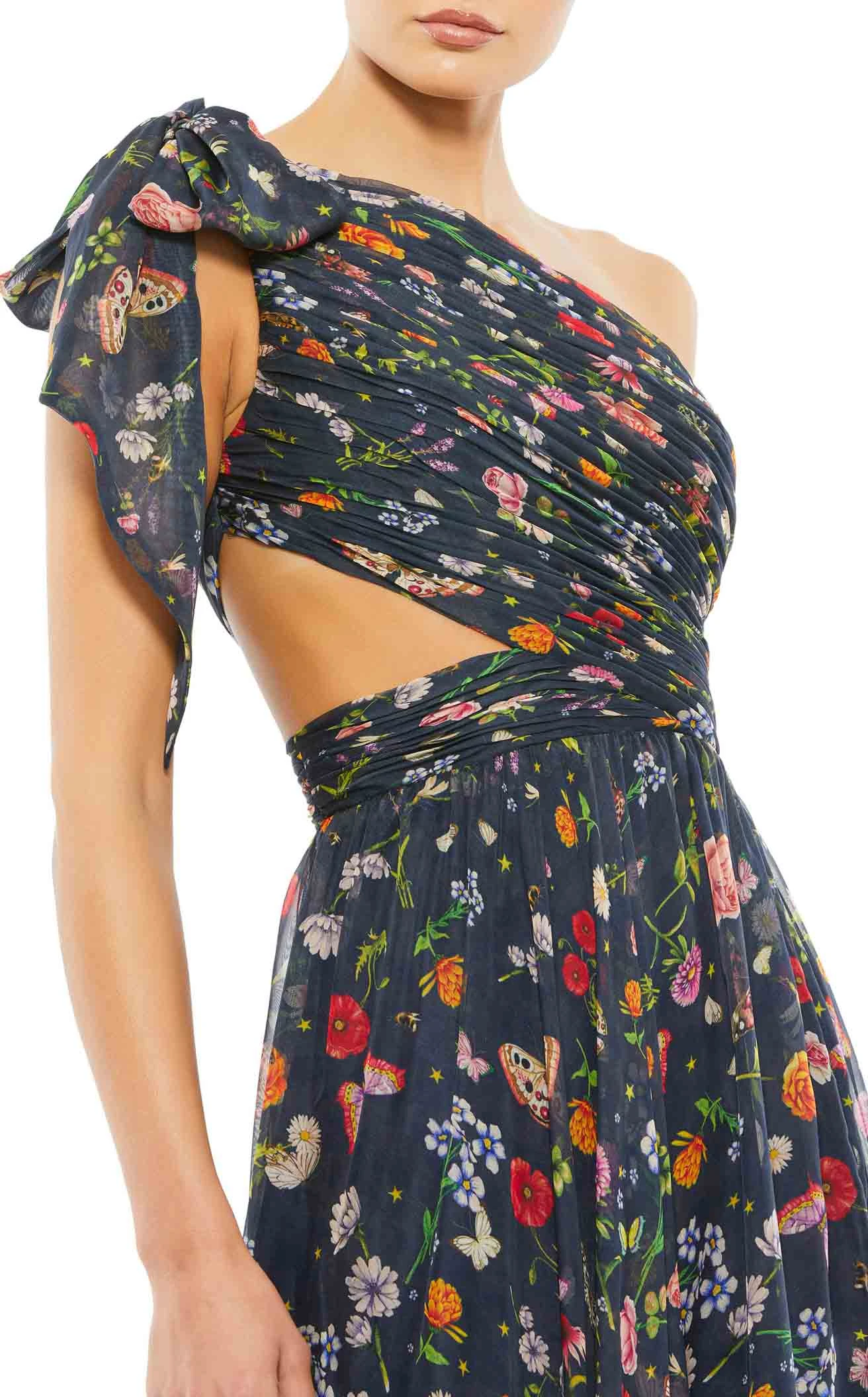 Uniqueness will be your middle name with this gorgeous dress designed by Mac Duggal. The dress has an asymmetrical neckline that boasts a bow at the shoulder. Decorated entirely with colorful patterns, the dress looks fun and lovely. The tight bodice shows off a cutout detail at the waistline. The floor-length dress has a long A-line skirt, magnificent with soft pleats and a thigh-high slit that keeps the temperature soaring.