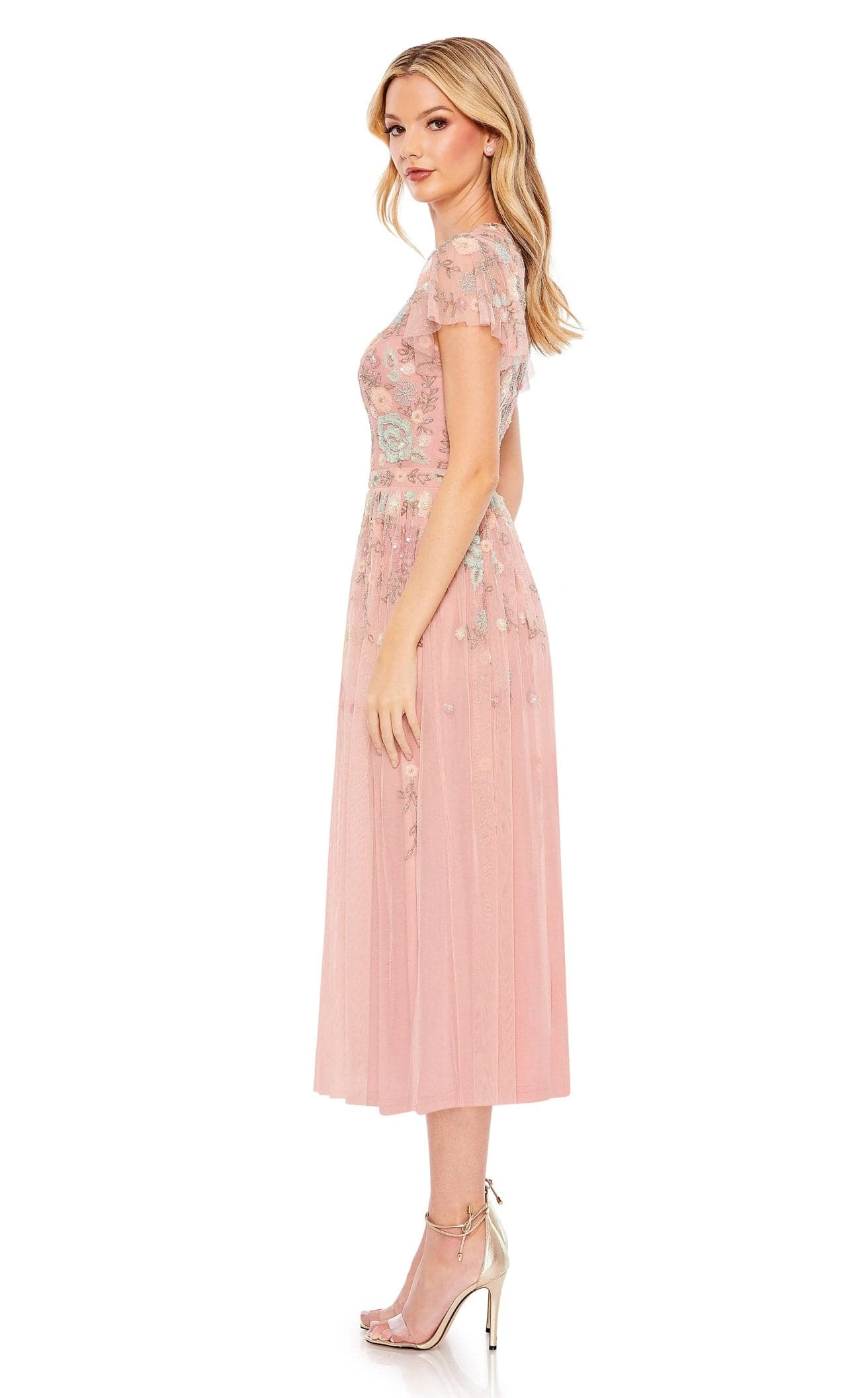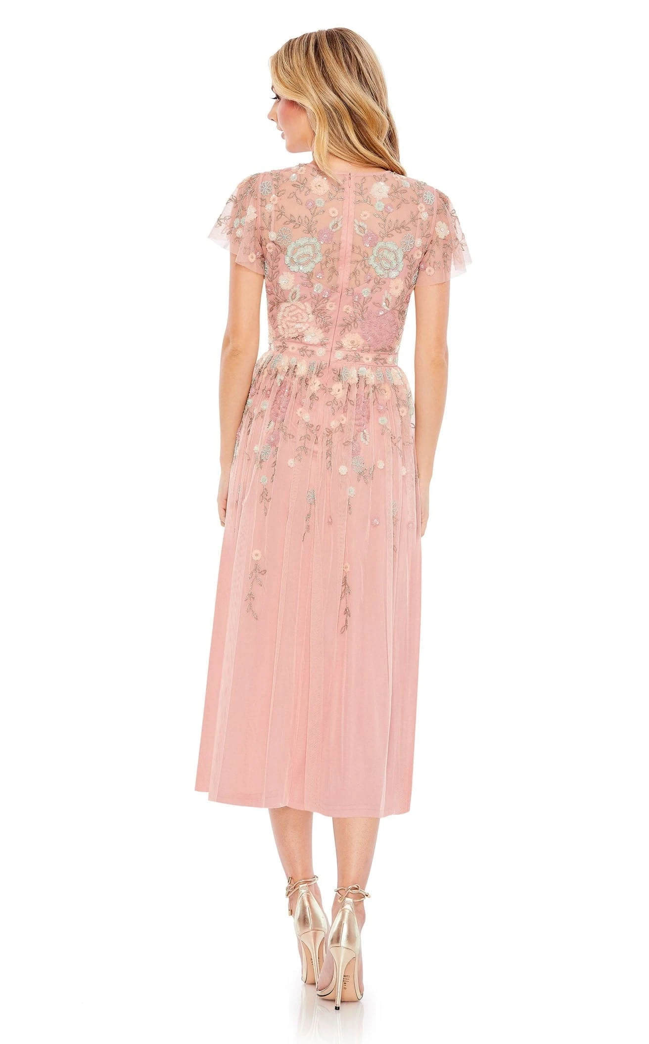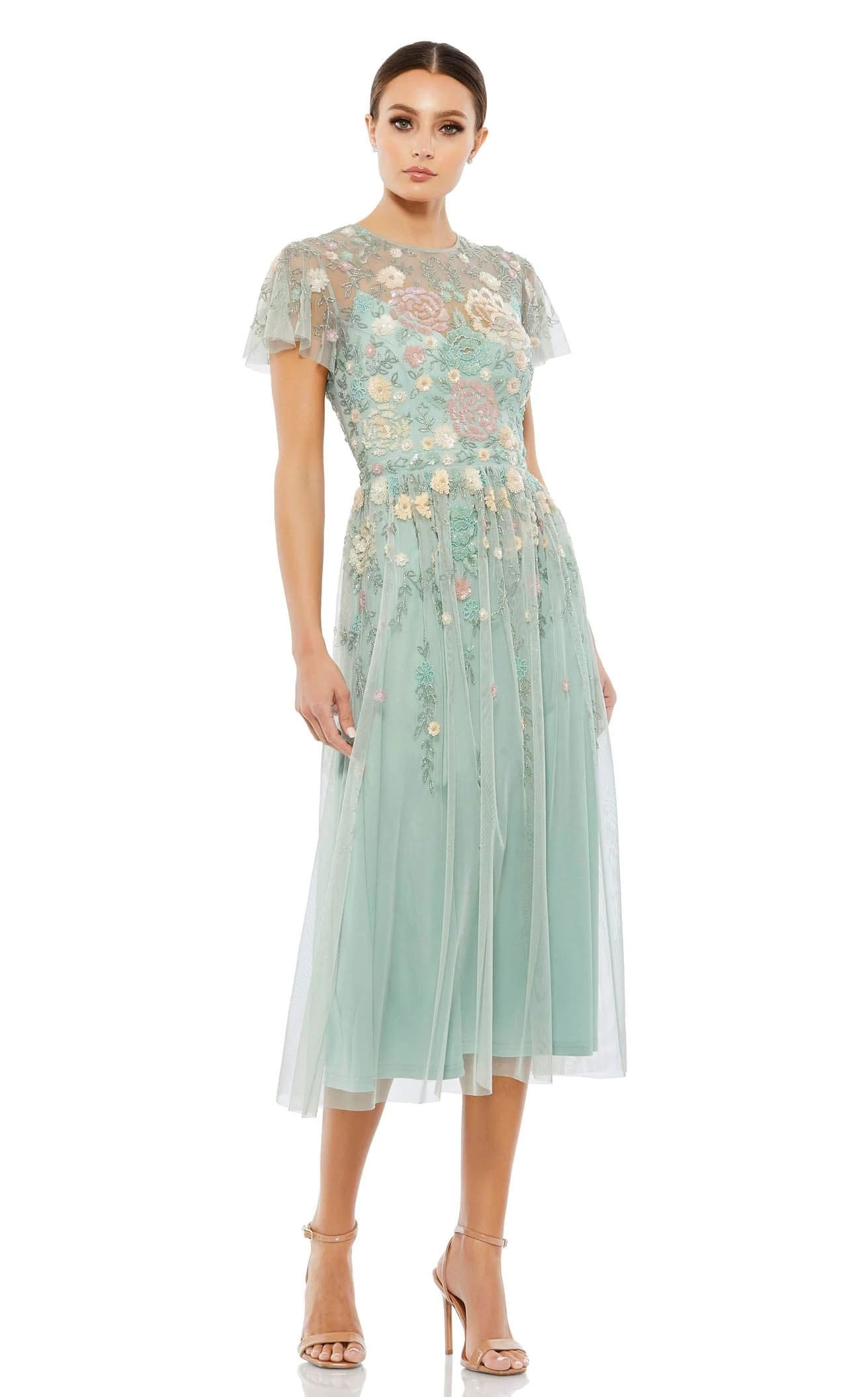 Wear this beautiful ensemble from Mac Duggal and radiate a subtle charm along with a bit of elegance at the cocktail party! Featuring a jewel neckline and flutter short sleeves, the dress has a concealed zippered closure on its back. Decorated with lovely floral lace applique and beads over the sheer fabric, the dress shows up a pleated A-line skirt that opens below the belted waist and flows to the tea-length hem.