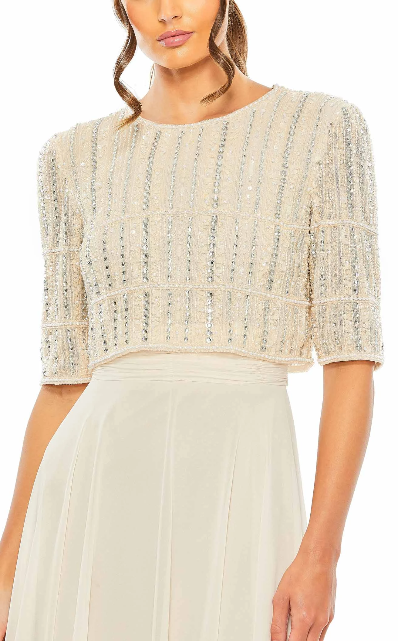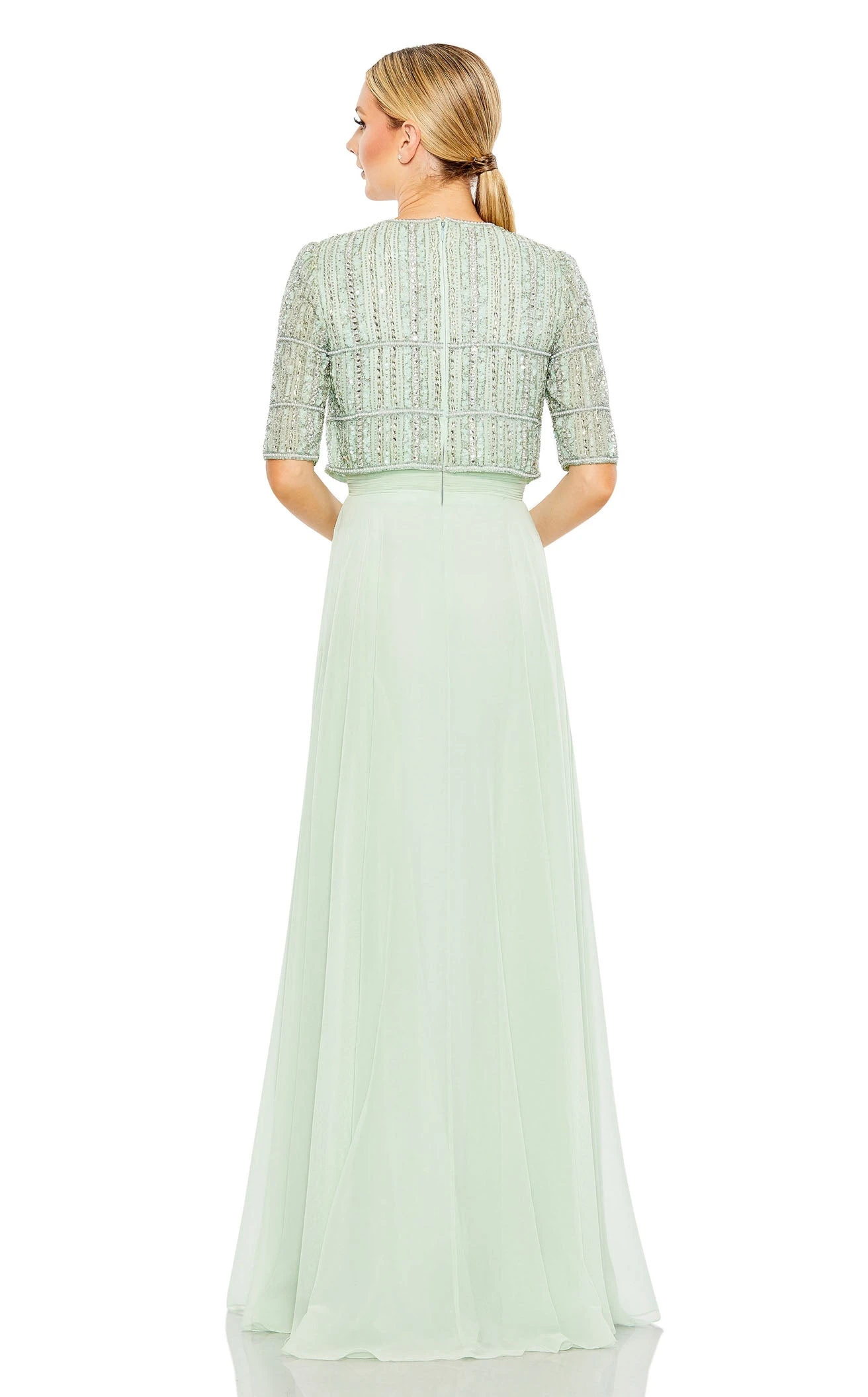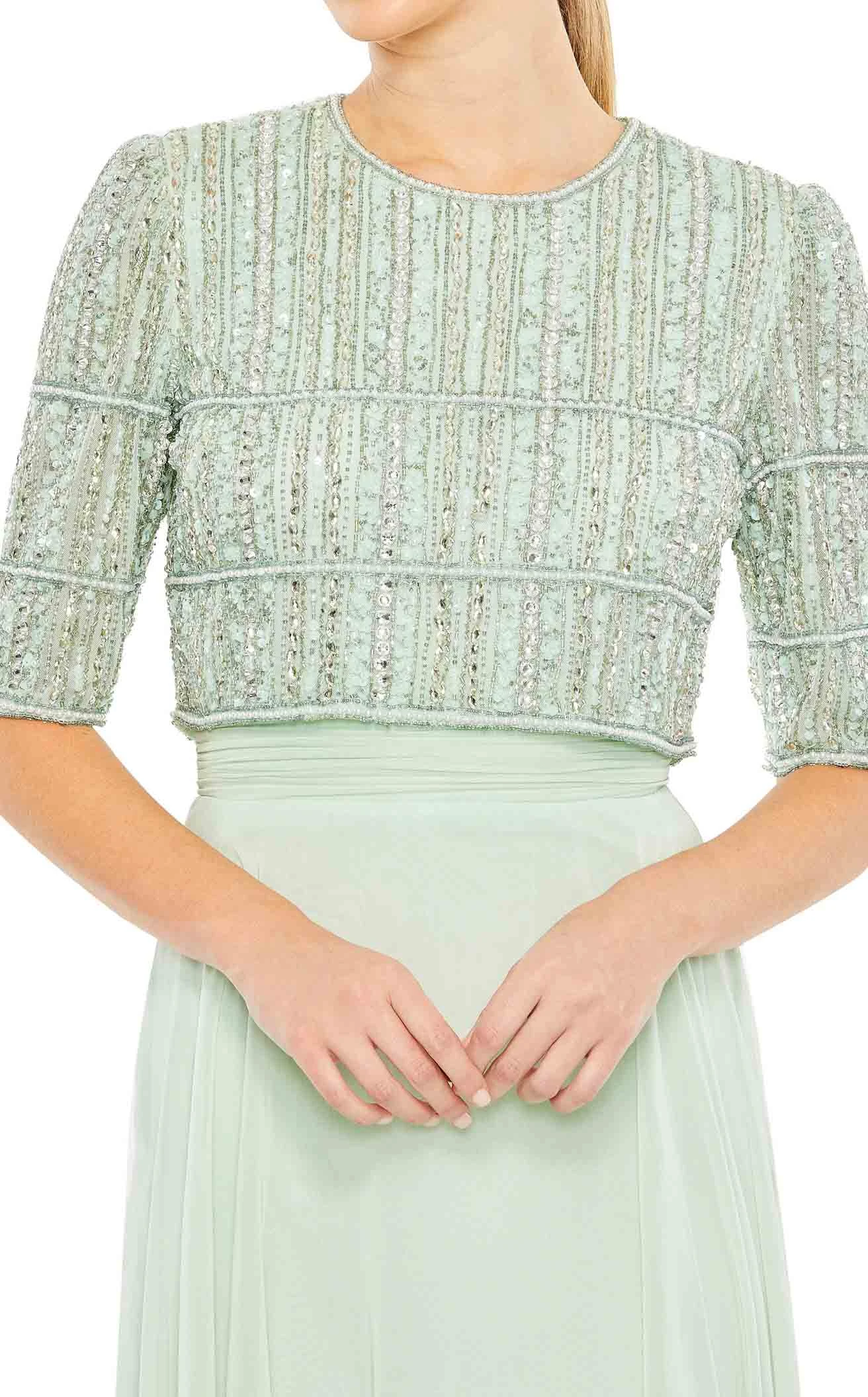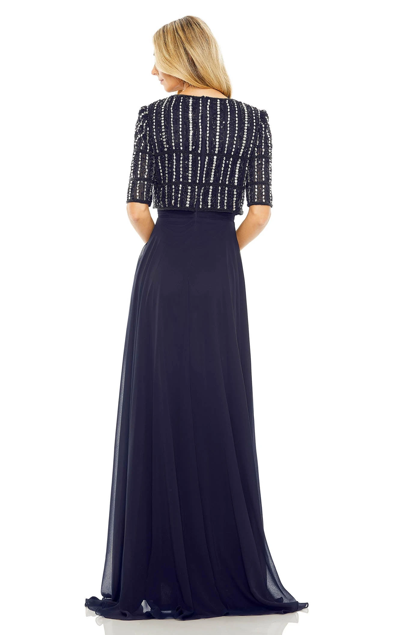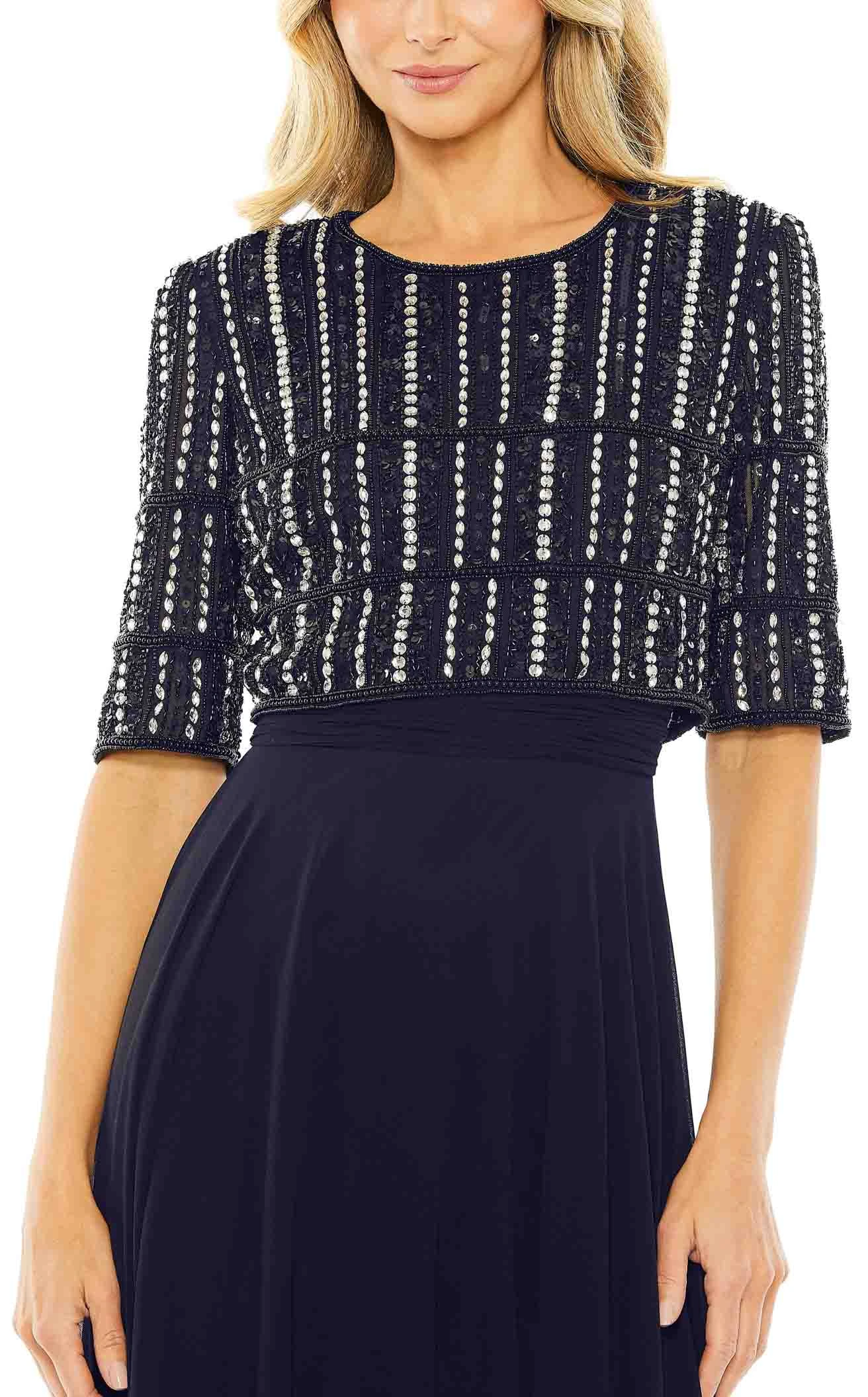 Make a statement by walking in the pretty Striped Floral Sequined Maxi Gown featured in the Mac Duggal 9180 Collection. The long gown features a striped sequin-embellished floral bodice with a classic round neckline complementing the half-length sleeves. The maxi dress flourishes an A-line skirt from the cinched waistline that falls effortlessly creating a fabulous cascade of naturally falling fabric.