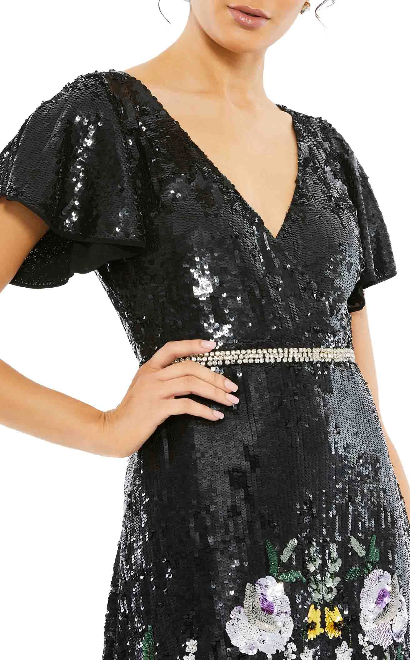 You are bound to look fantastic when you slip into this elegant dress from the collection of Mac Duggal 93594. This glamorous dress showcases a V-neckline and short flutter sleeves and is showered with sequin embellishments throughout. The waist is festooned with beautiful beaded embellishments whereas the tea-length skirt is enthralled with multi-colored sequins to form a beautiful floral pattern.