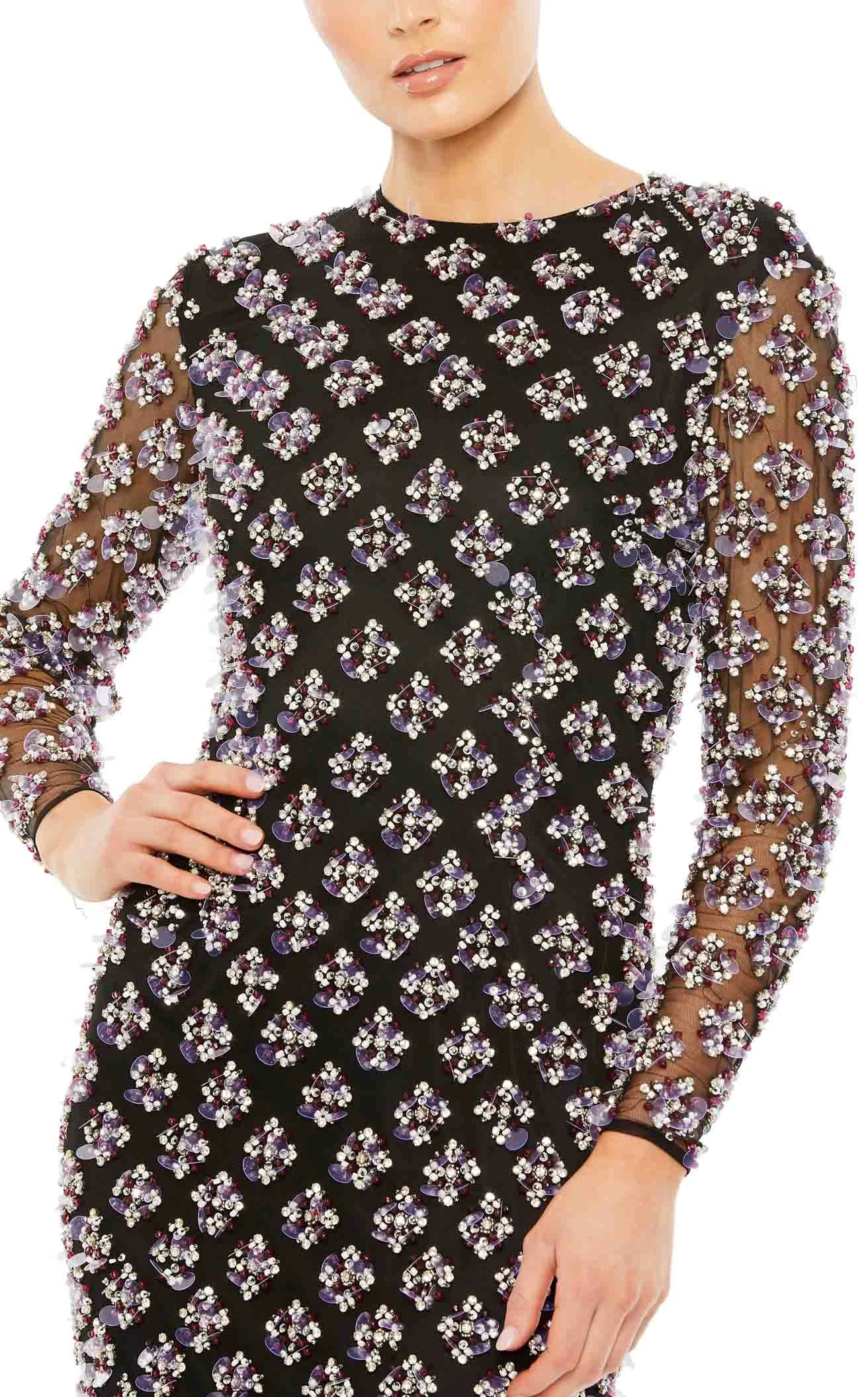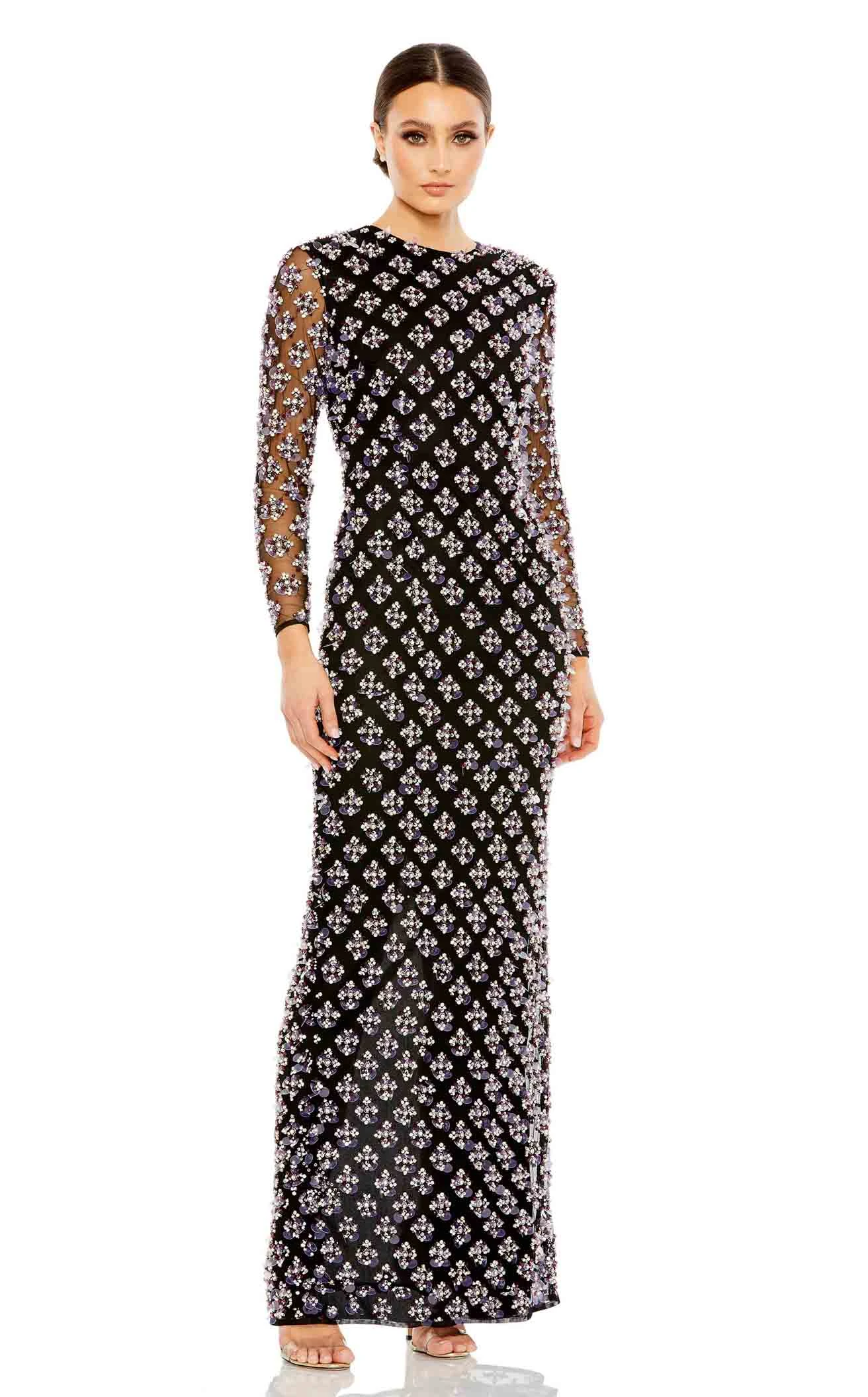 Flatter your best features while glistening with sensual grace by wearing this masterpiece from the collection of Mac Duggal 93618. Adorned with beaded embellishments in geometric shapes, this graceful gown is detailed with a jewel neckline and long sheer sleeves. The column silhouette skirt elegantly drapes down to the full length.