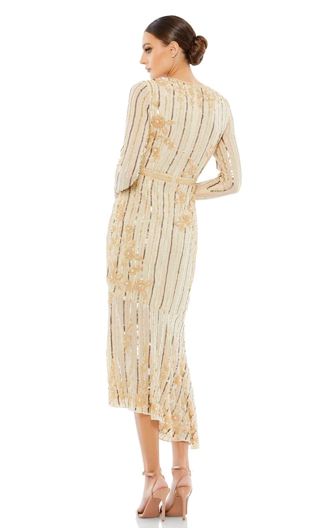 An absolute red-carpet knockout, this gorgeous dress from the collection of Mac Duggal is sure to direct everyone’s attention toward you. Envisioned in an elegant jewel neckline and long sheer sleeves, this beautiful creation is drizzled with intricate floral beading throughout that is complemented by hand-stitched sequins. The skirt ends in an asymmetrical hemline.