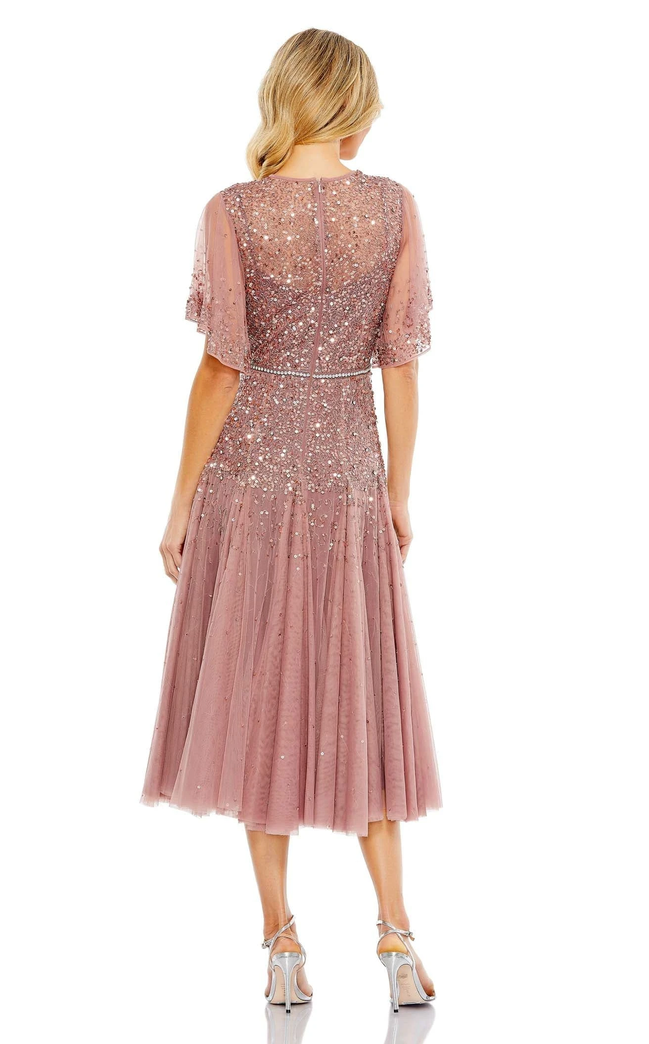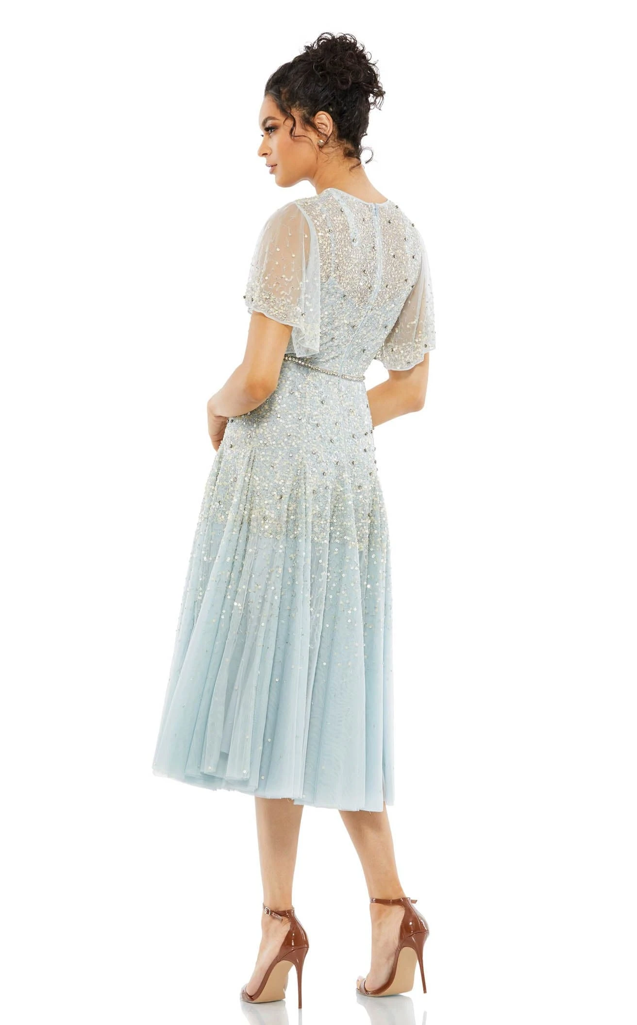 Featuring a tea-length design, the dress designed by Mac Duggal looks chic. Pair it with high stilettos and your favorite jewelry and you are ready to go for your big event. The bodice features a V-neckline with an illusion high neckline overlay, short flounce sleeves, and a concealed zippered back closure. Featuring a rhinestone encrusted waist detail and embellished mesh overlay, the dress keeps you in the spotlight.
