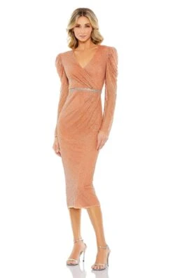 Designed on a bodycon silhouette, the midi-length dress by Mac Duggal accentuates your features. The fitted bodice showcases a surplice neckline and long mutton sleeves with a zippered back closure that offers ease while wearing. Adorned with beads, the waistline adds a touch of glamor and an allover design that enhances the look. Pair it with high stilettos and sleek elegant earrings for a party-ready look.