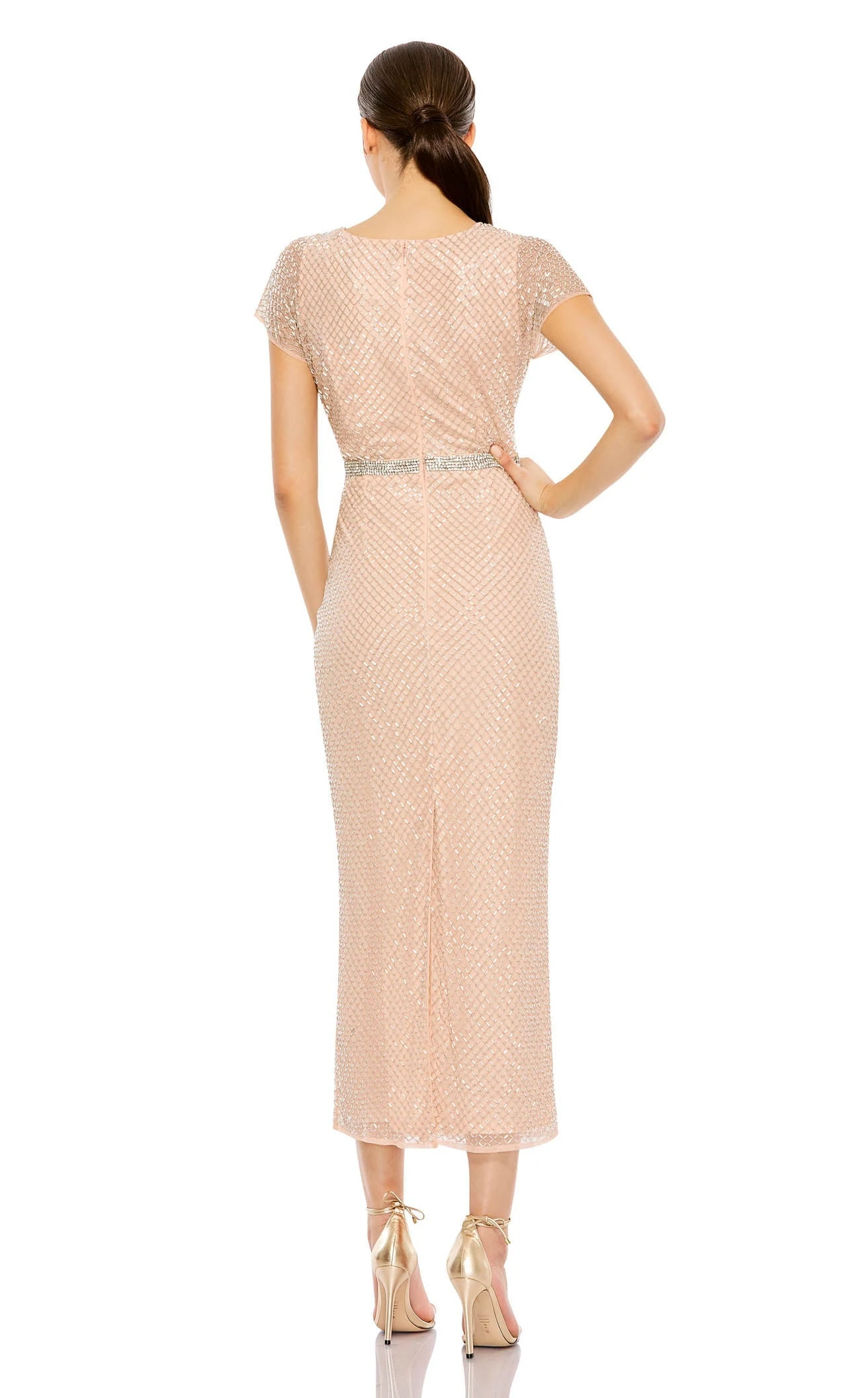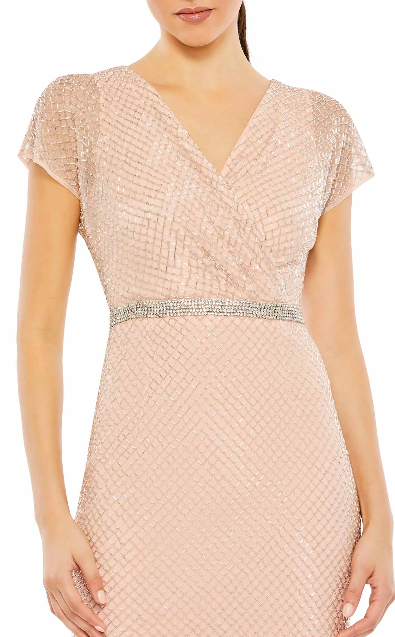 Wrap Around V-neckline Sheer Fishnet Embellished Waistband Fitted Dress by Mac Duggal