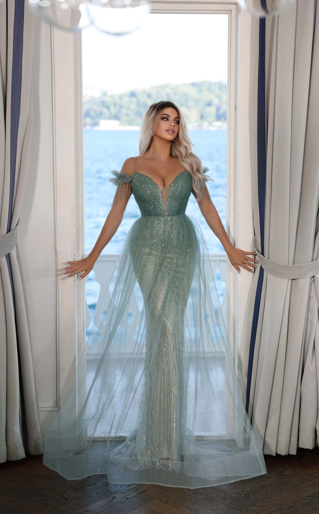 Steal the spotlight wearing this shining M22404 Modessa Couture gown. The bodice features a cold shoulder style with feather and fringe detailing. Its plunging neckline has a sheer insert for modesty while the waistline has a sleek sequin belt. Featuring an appealing look, the A-line skirt has a glistening mesh overlay and ends with a flowy sweep train.