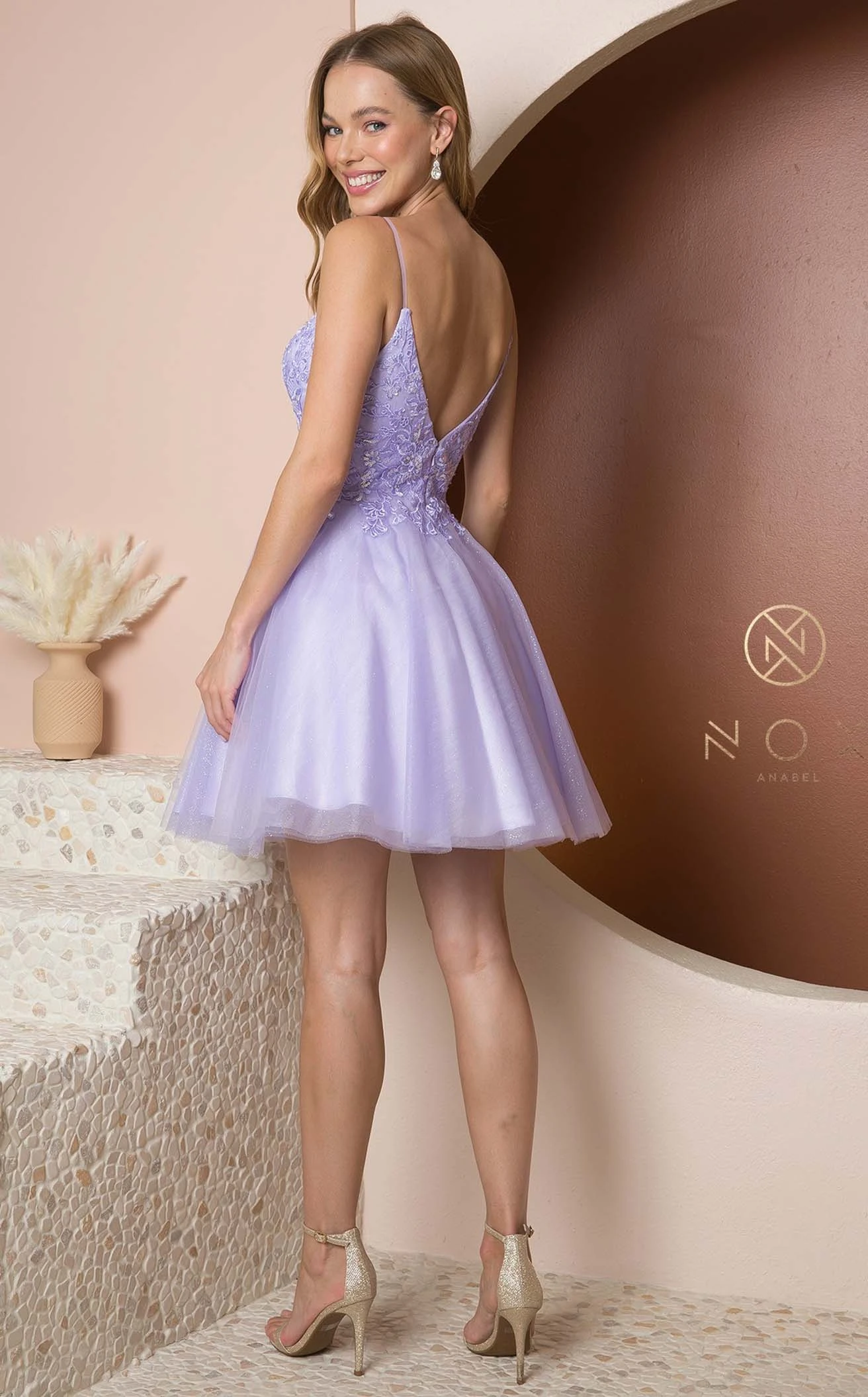 With a classic style and chic look, this dress by Nox Anabel E777 is perfect for any occasion. The V-neckline is accented with a sequin-embroidered detail that runs throughout the length of the torso. The dress has a slight flare to the glitter tulle skirt, with a knee-length hemline. The dress closes with a hidden zipper on the back. The A-line skirt has an attached underskirt for a complete look.