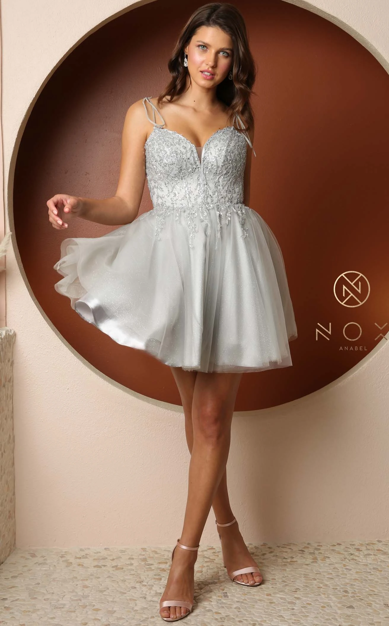 A delicate, beautiful, and luxurious dress by Nox Anabel F732 perfect for any occasion. Made of high-quality polyester and breathable fabric, this dress is comfortable and fashionable. The sleeveless sweetheart neckline along with delicate tie detailed straps spanning across the shoulder and open back will make any woman feel confident and elegant. The torso shows delicate beadwork that compliments the glitter tulle skirt.