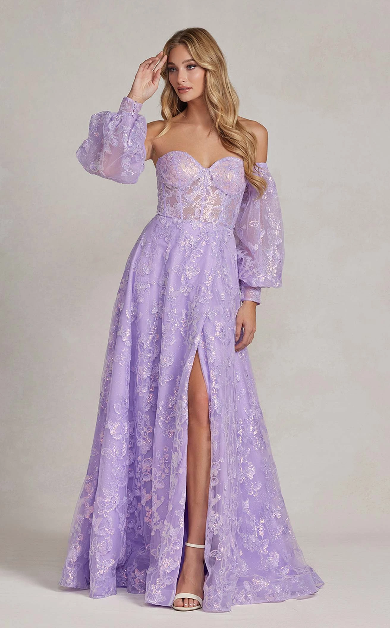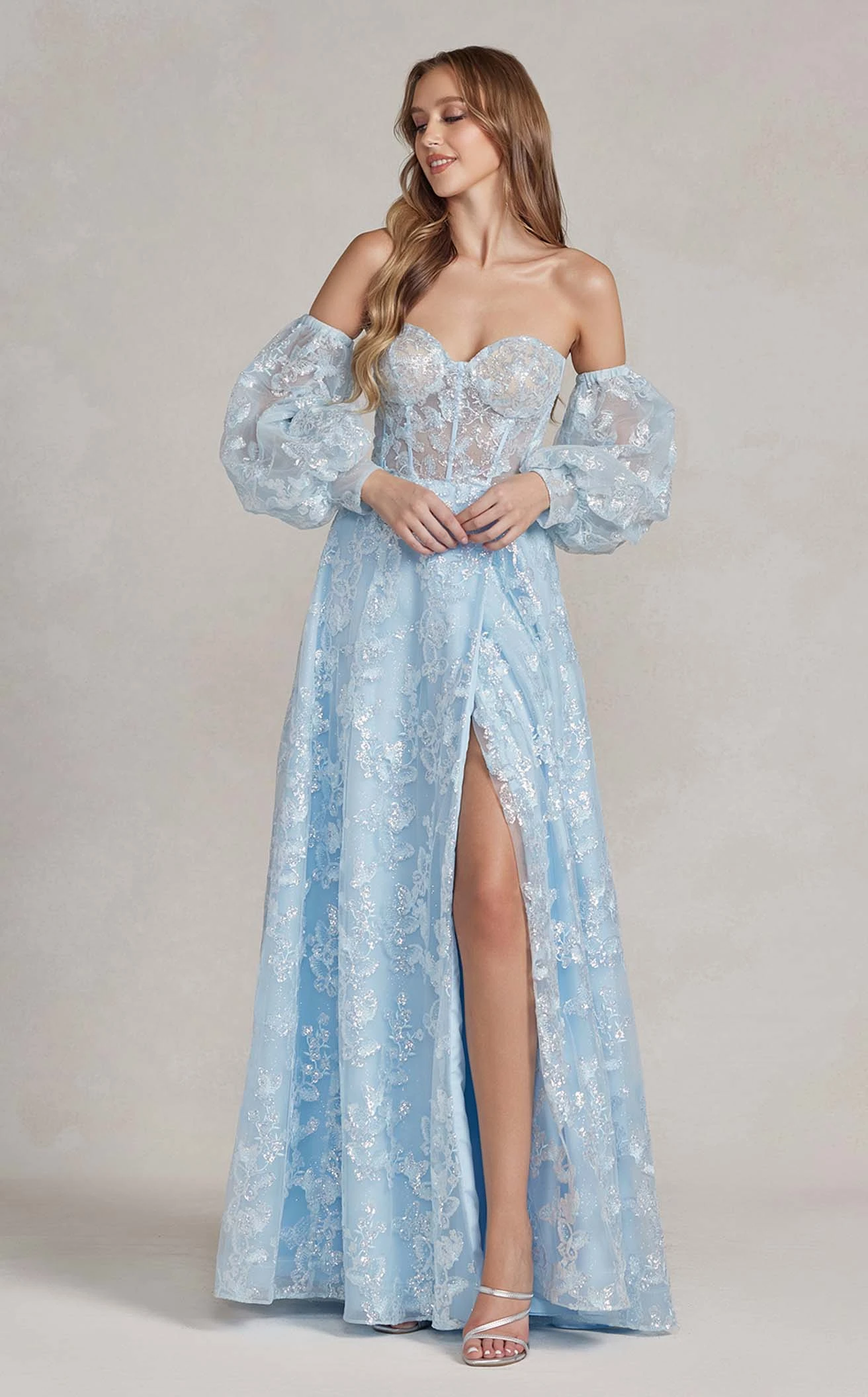 Grab the attention of your boyfriend as you enter in this beautiful dress designed by Nox Anabel K1155. It comes with detachable off-shoulder long balloon sleeves. It has a sheer illusion-boned bodice. The sweetheart neckline adds a wonderful touch to the bare shoulders. The natural waistline succeeds a full-length A-line skirt with a thigh-high slit.