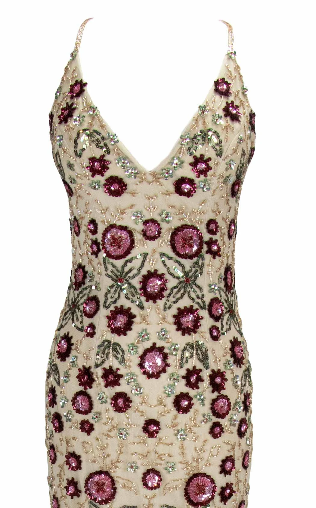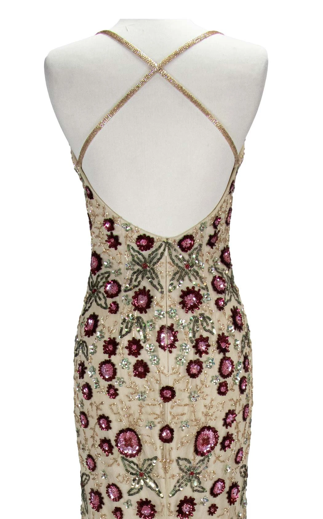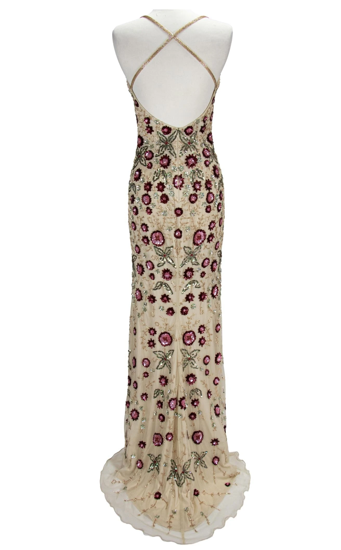 Look gorgeous when you wear this remarkable party dress from Paul Rekhi. The fitted bodice showcases a plunging V-neckline and criss-cross strappy back. The charming creation has an overall floral applique pattern that makes it an instant attention grabber. This sheath dress has a straight silhouette skirt with side slit which touches the floor and finishes off with a sweeping train.