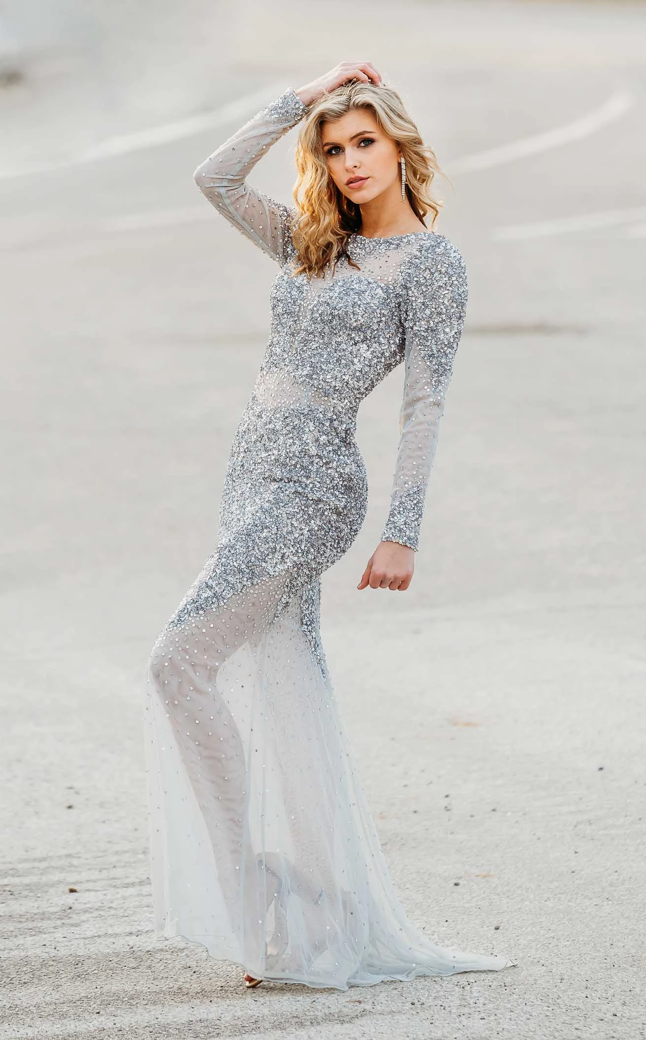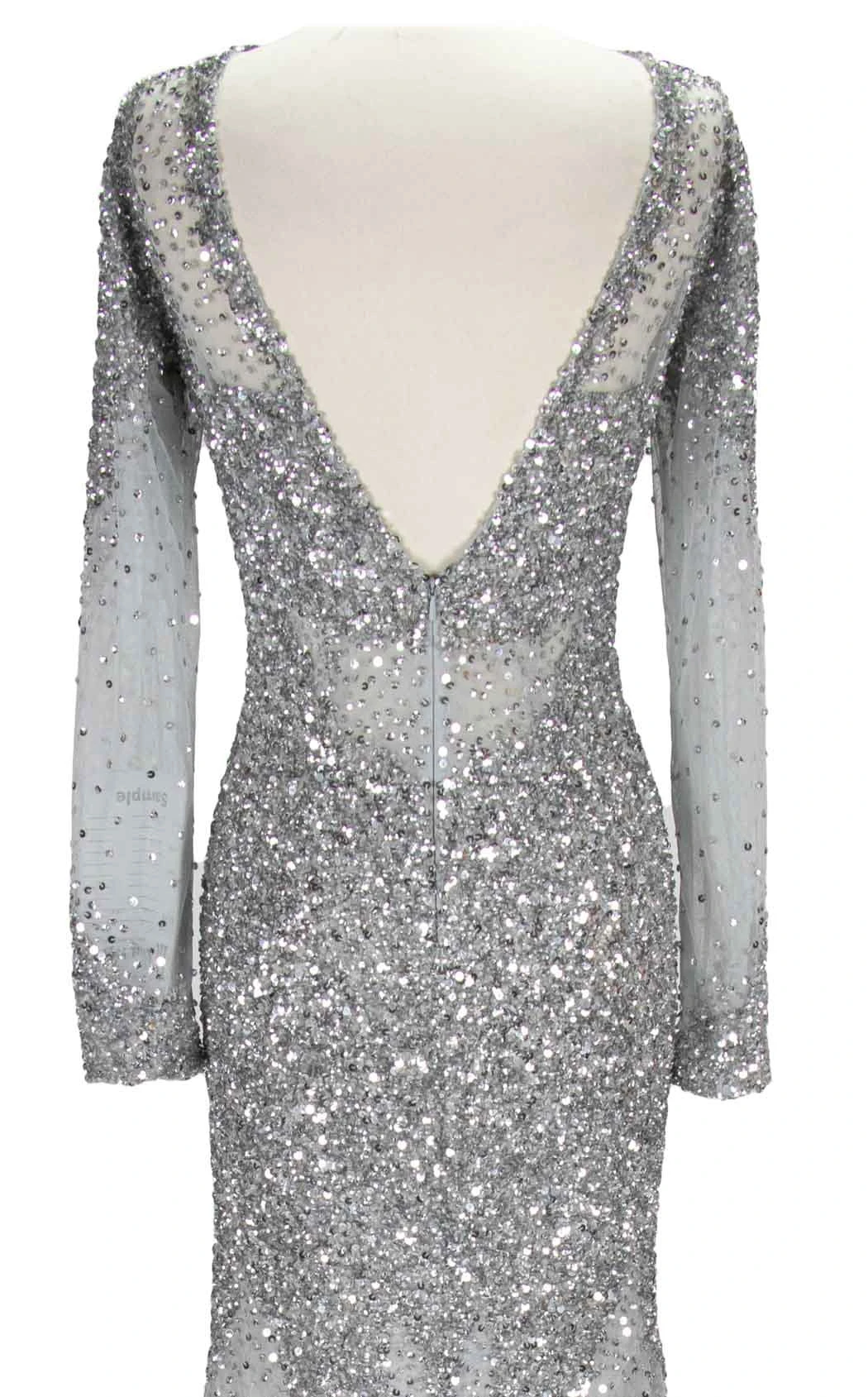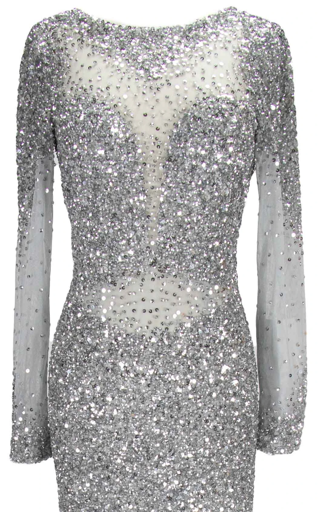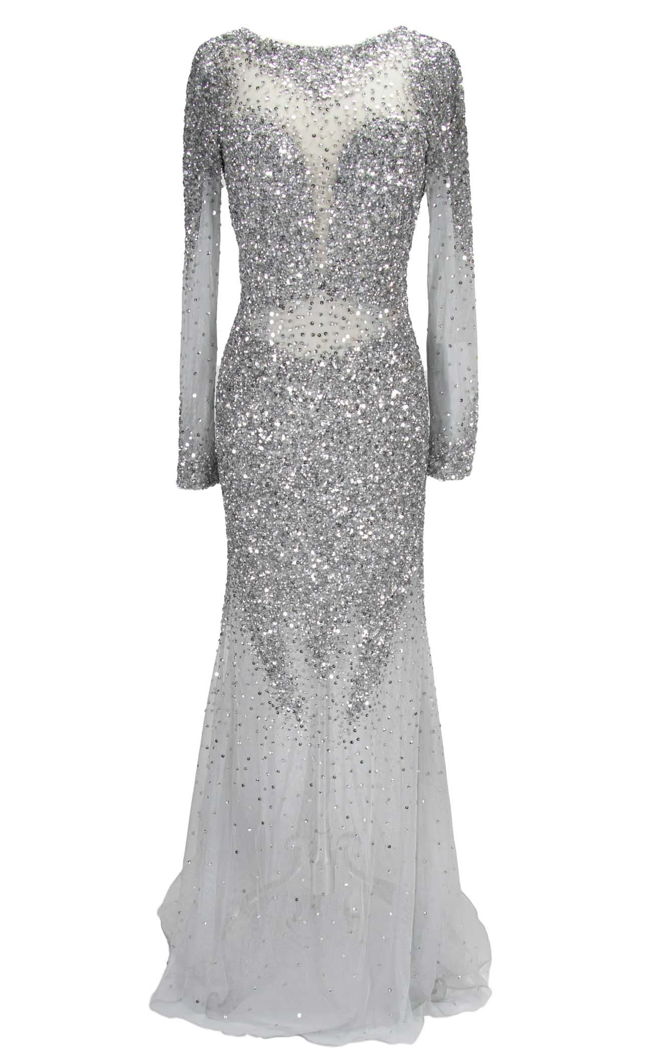 Look truly remarkable at the upcoming special event in this striking dress from Paul Rekhi. The fitted bodice exhibits sequin embellishment which cascades down the waist. This dress features an illusion neckline, long sleeves, an open back and sheer detailing at the waist. An exquisite ensemble which is designed with a sheath silhouette tulle skirt that runs to the full-length and ends with a horsehair hem.