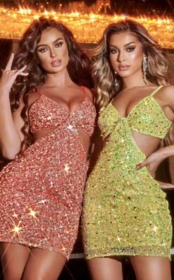 Flaunt your bold side to the world by donning this sensual mini dress from the collection of Portia and Scarlett PS22480C. Highlighting a plunging V-neckline, this ravishing attire is festooned with glistening sequin embellishment throughout its length. The bodice is adorned with a plunging V-neckline and narrow shoulder straps. The sheath skirt gracefully flows down to a short hemline.