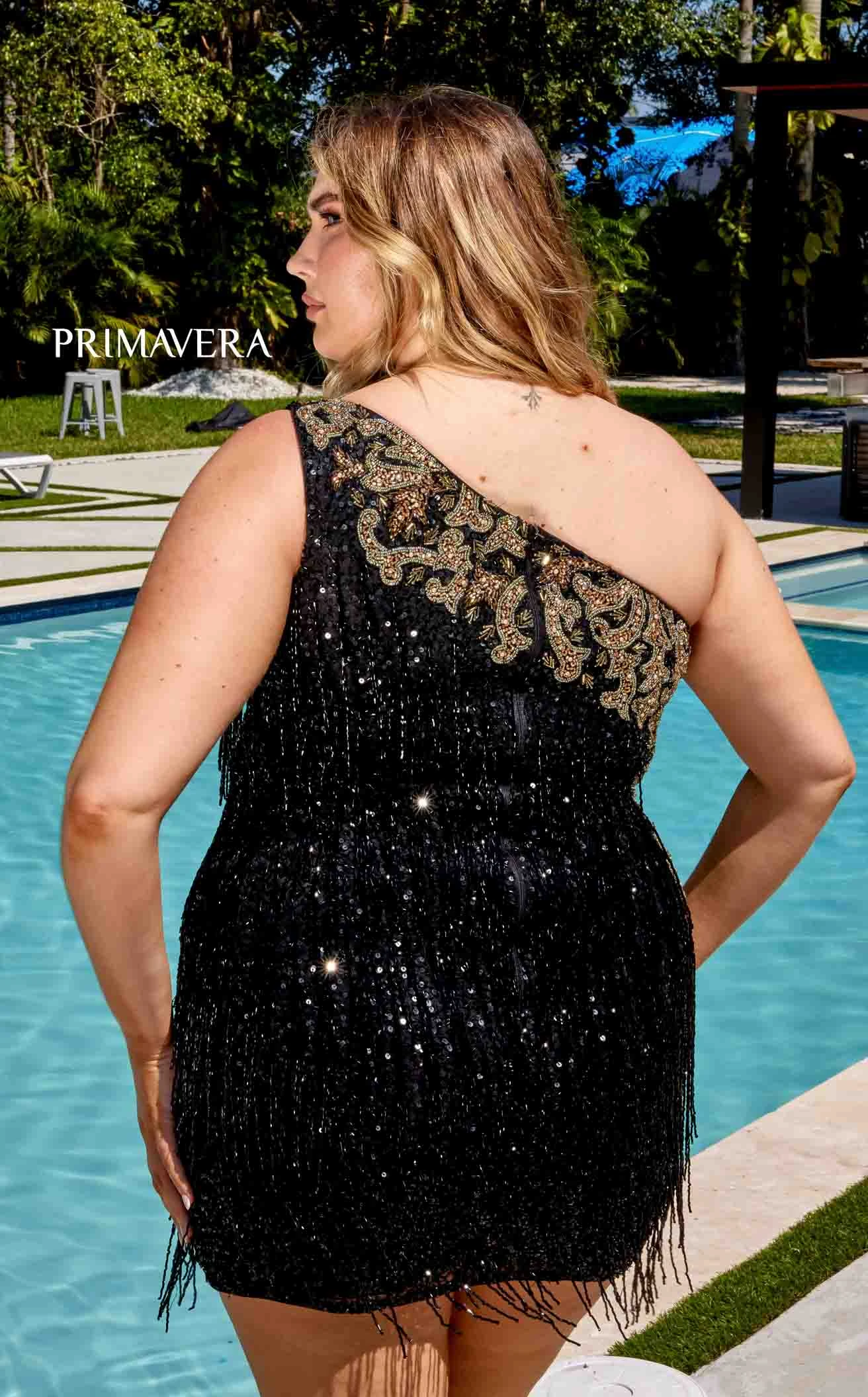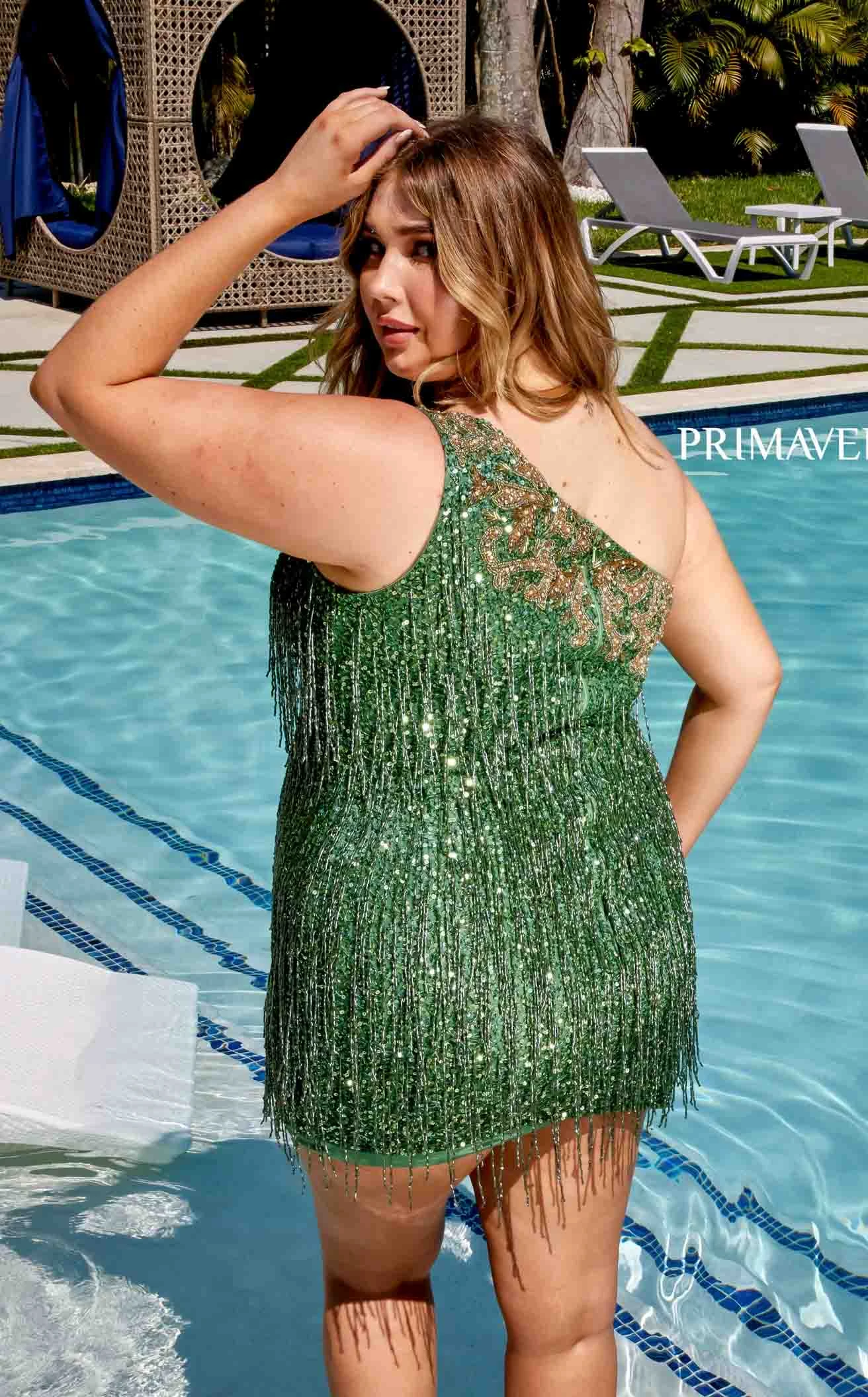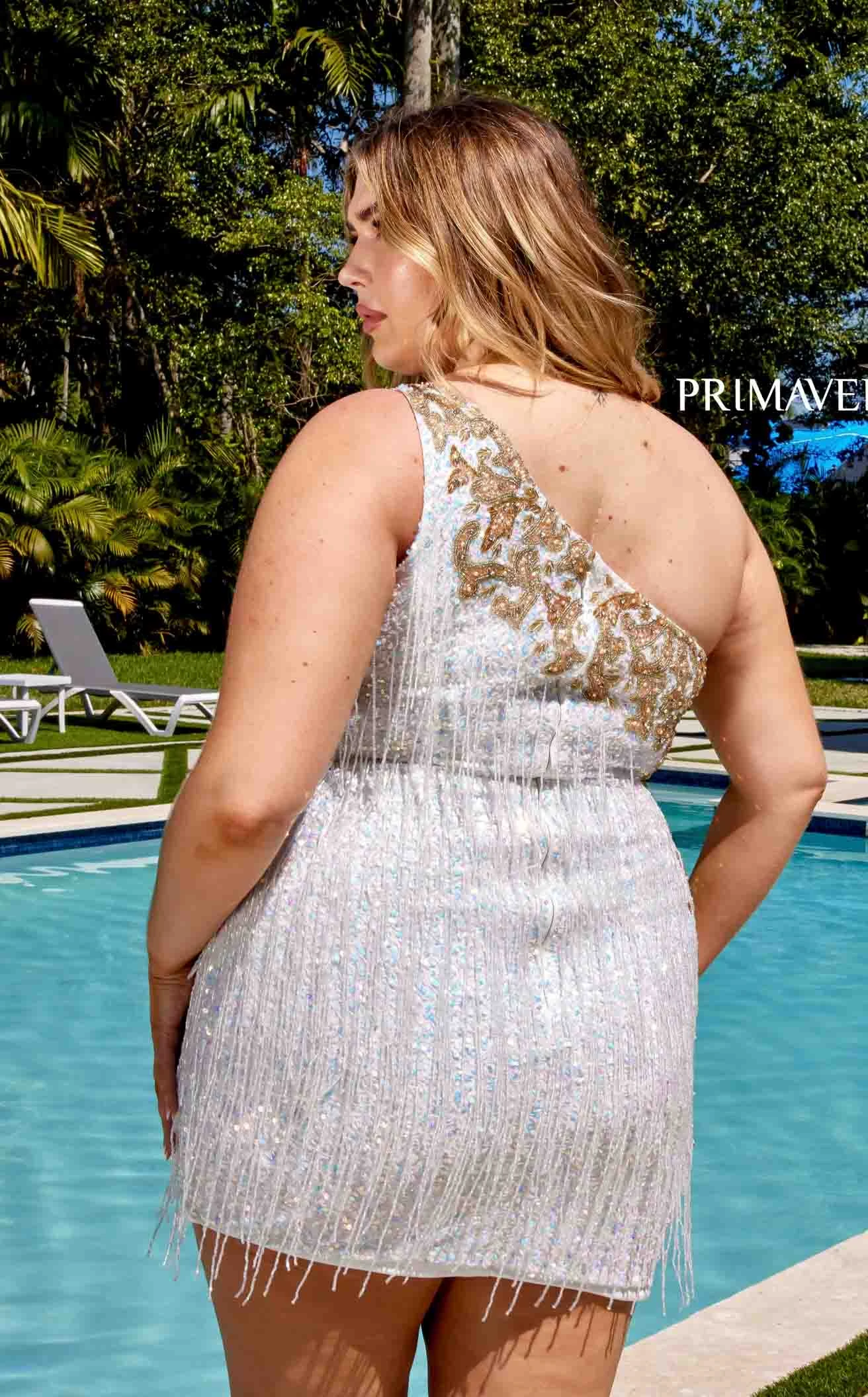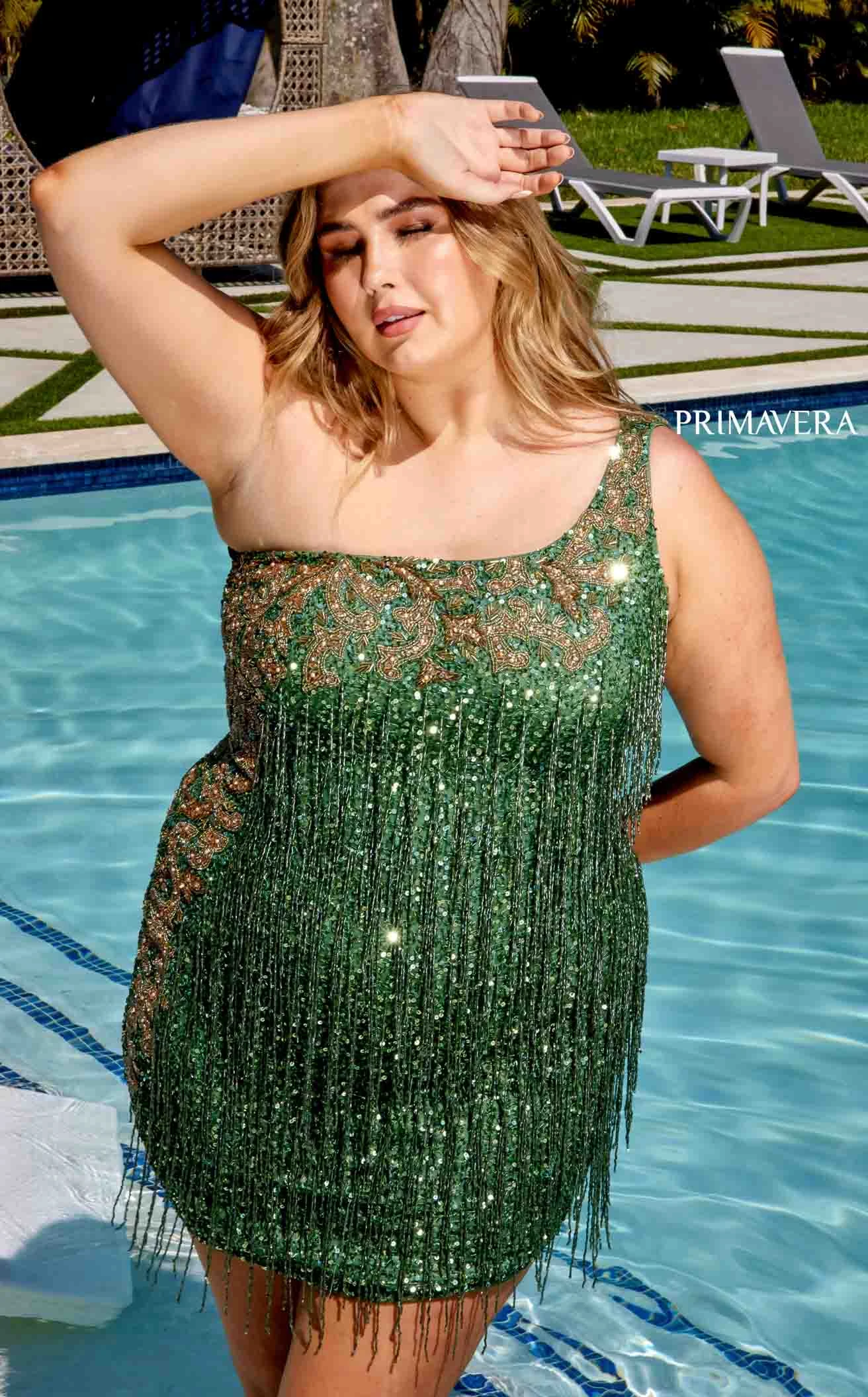 This beautiful Primavera Couture 14026 dress can be a show-stopper attire for the ramp show. It features contrasting beaded embellishments along the hem of a one-shoulder neckline. It easily catches one’s attention with fringe embellishments and sequin stretch fabrication. With a sheath silhouette, the dress has a short-length hem and a sleeveless design.