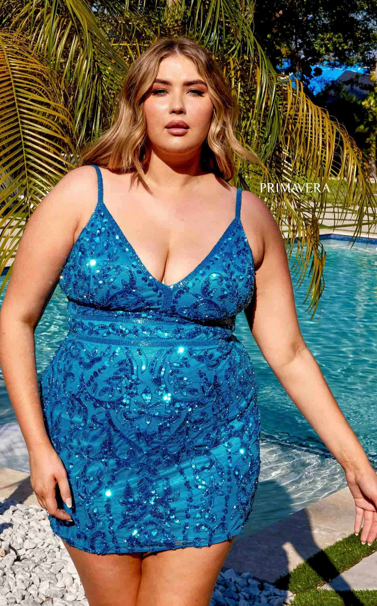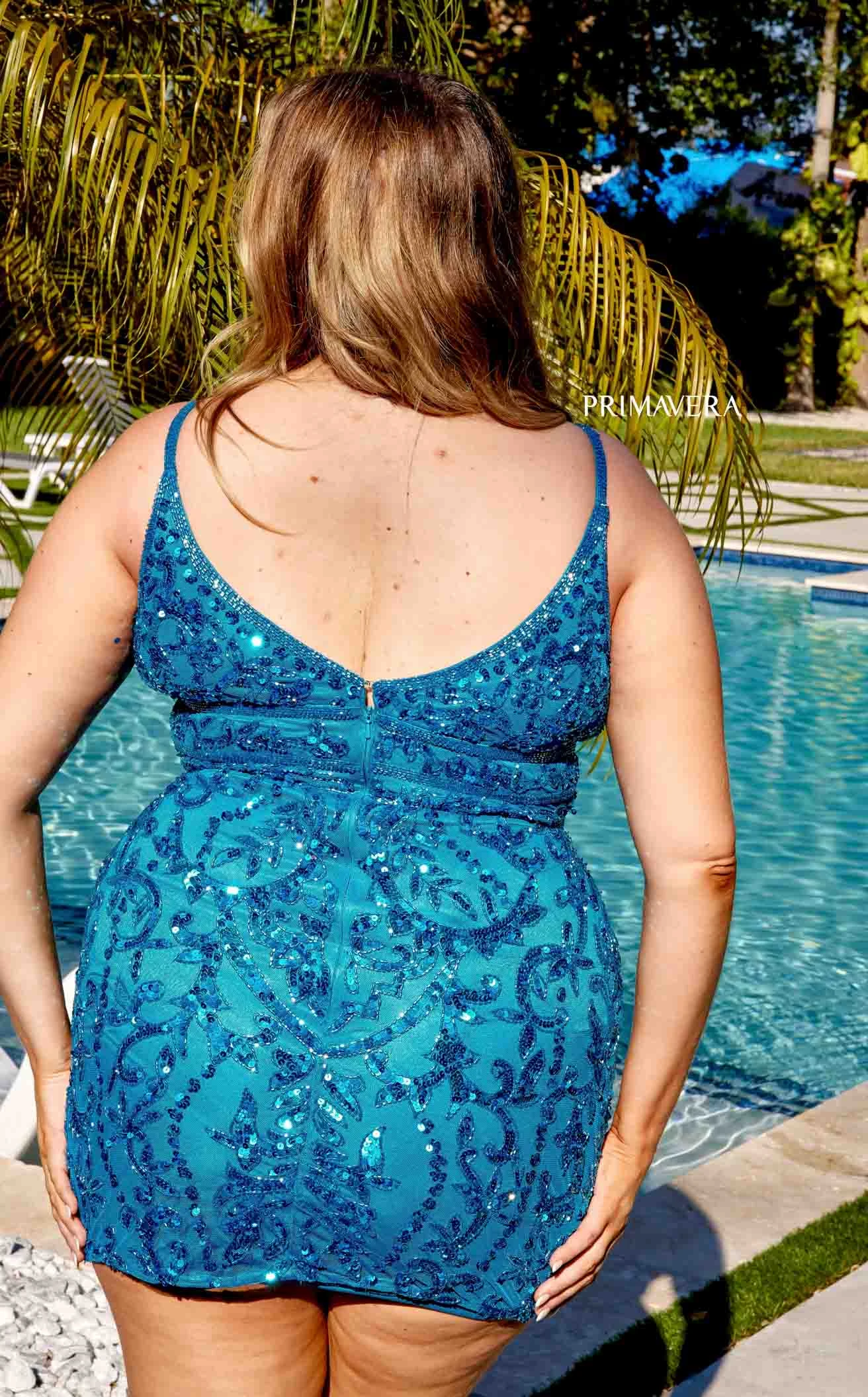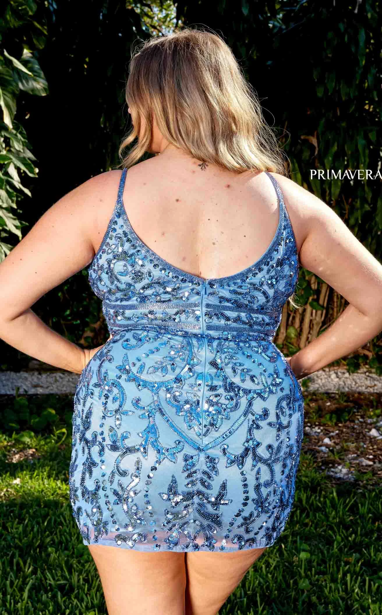 The Primavera Couture 14035 dress is designed to fill your ears with compliments. The shimmering beaded lace makes the dress very attractive and helps the body-fitting construction emphasize your feminine curves. The thin spaghetti straps highlight the dress’s V-neckline and hold it securely from the shoulder. It is a mini-length dress and an excellent choice for a night out with girls.