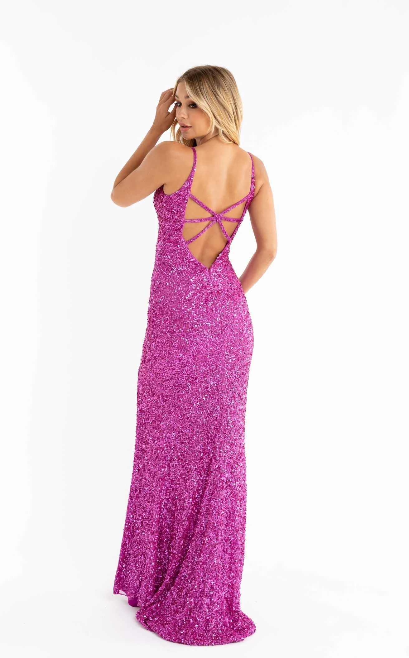 Look like an angel in this divine outfit by Primavera Couture 3792. The sleeveless bodice reveals a plunging V-neckline, spaghetti straps and an open back with three straps on each side that meet in the middle. The fully embellished dress is adorned in sequins and glitter accents. The wrapped waist allures a high slit to flaunt your sexy legs. The stunning silhouette features a full-length hem and a sweep train.