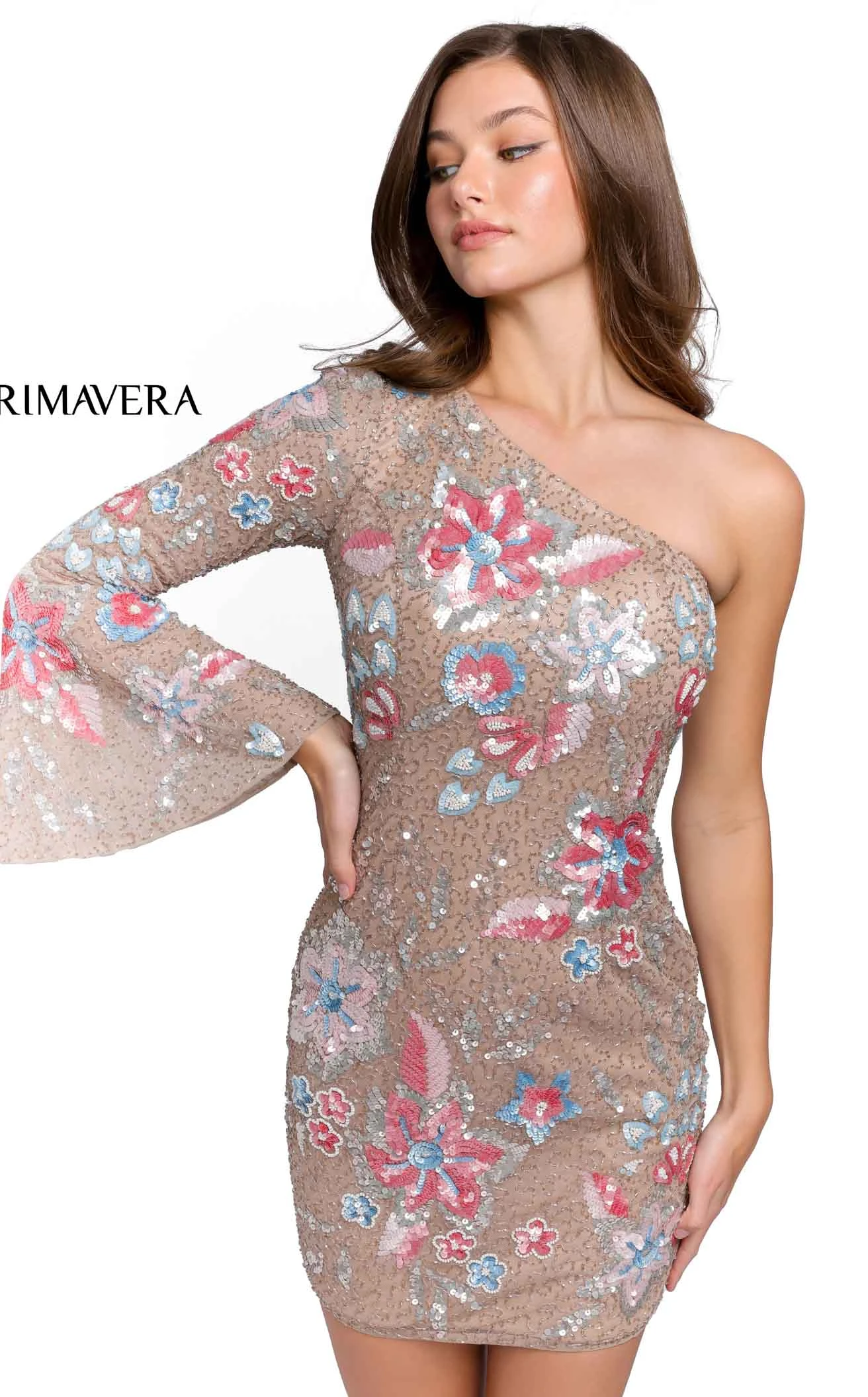 Make a statement in this eye-catching short dress by Primavera Couture 3810. This dress flatters the figure with a fitted silhouette and floral beaded patterns that trail onto the single fit and flare long sleeve. Feel sophisticated in an asymmetrical neckline that adds a feminine touch to the dress. A simple zip up closure completes the back of this dress.