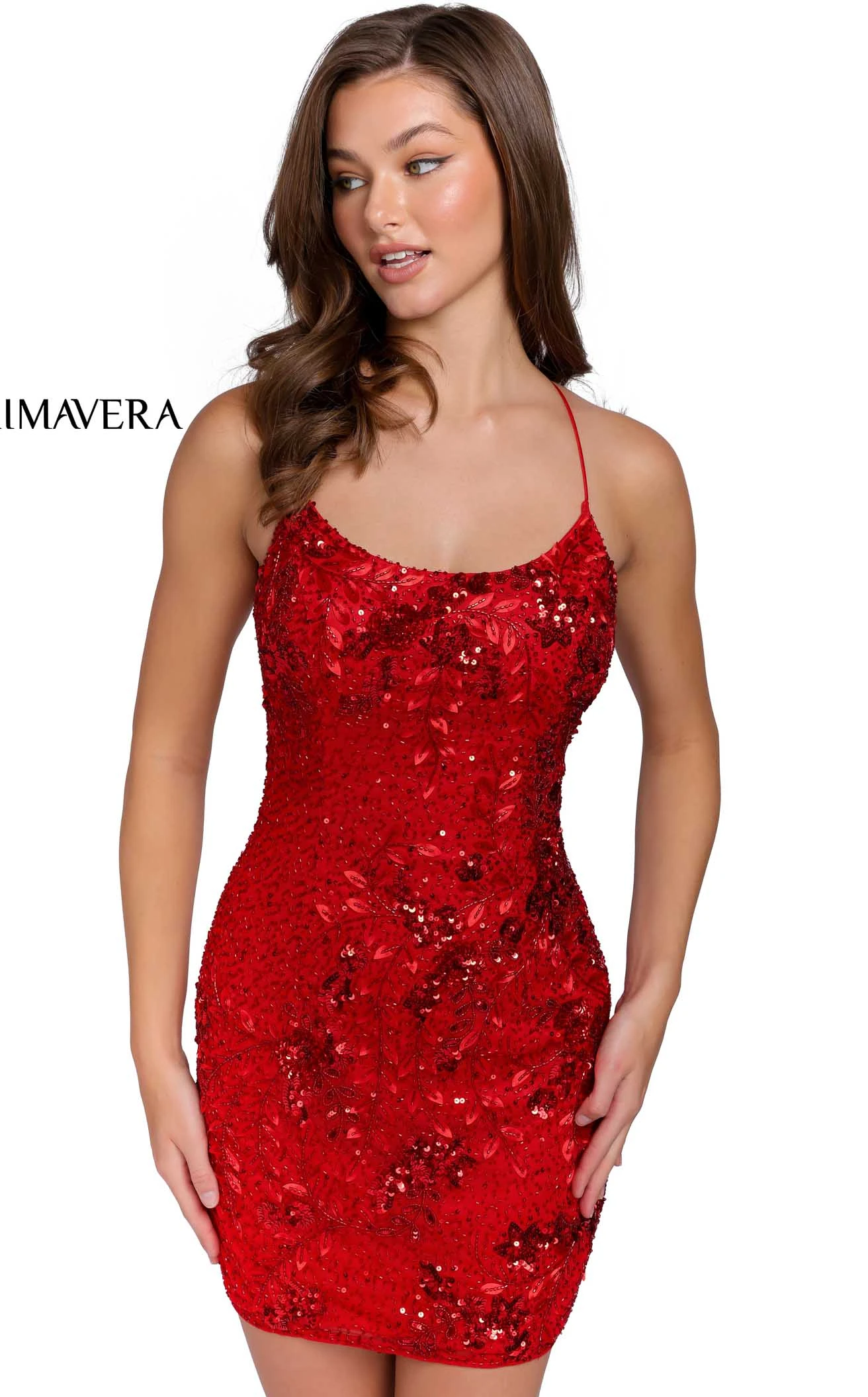 This gorgeous short style by Primavera Couture 3816 will add a pop of color to your outfit. The fitted bodice features a flattering scoop neckline that flows into an eye-catching corset lace-up back for a custom fit. Floral designs and beadwork create an enchanting atmosphere, leaving you looking and feeling confident as you enter.