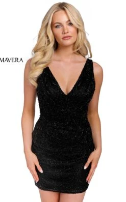 Attract attention by wearing this stunning short style by Primavera Couture 3826 to your special event. The fitted dress features a fitted silhouette adorned with hand sewn bead work that is sure to turn heads. The modest V-neckline is complemented by thick straps that wrap into a dramatic open back with a centered zipper closure.