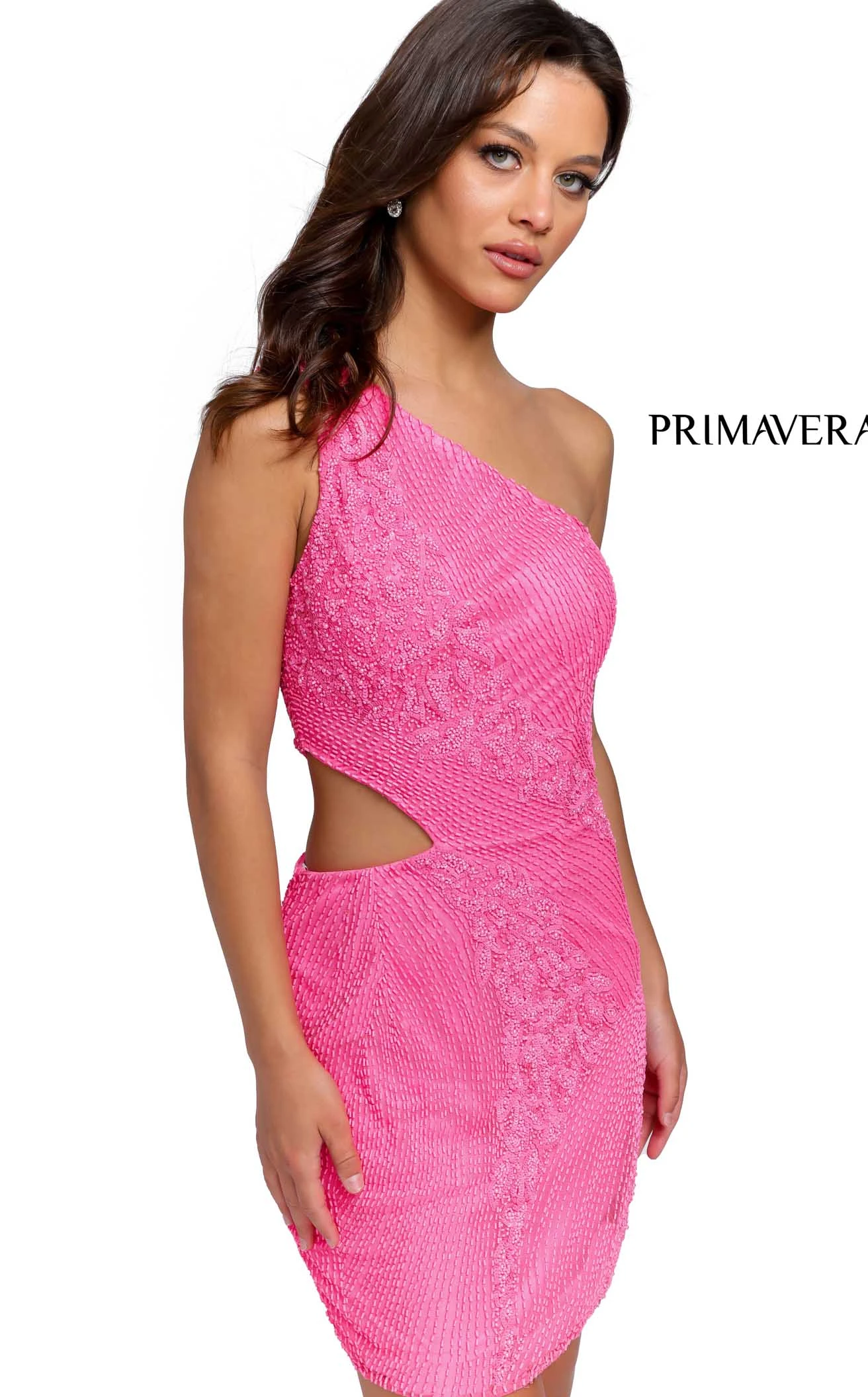 In a trendy short dress by Primavera Couture 3840, you’ll be the best dressed at your special event. With a trendy midriff cutout on the side, an asymmetrical neckline, and one shoulder strap, you’ll be the center of attention. Shine brightly in this extravagant short dress with intricate patterned beadwork making it a show stopping piece.