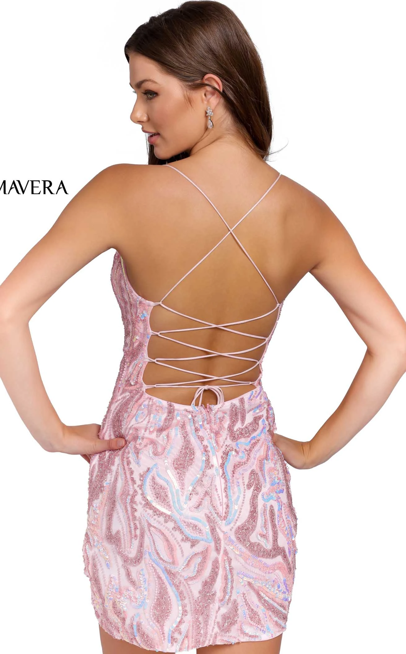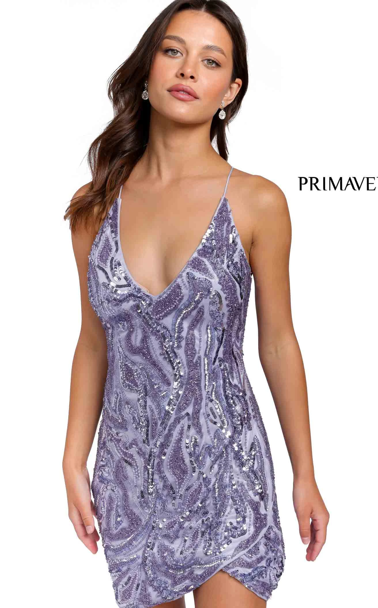 Be fashionable in a mesmerizing patterned short dress by Primavera Couture 3844. This dress has a fashionable V-neckline and a fashionable corset lace up. The fitted silhouette flatters your figure and is fully embellished with dazzling sequins and beadwork that creates a stunning wavy pattern. The flattering silhouette will make you feel like a goddess while the sequin embellishments add a touch of glamor.