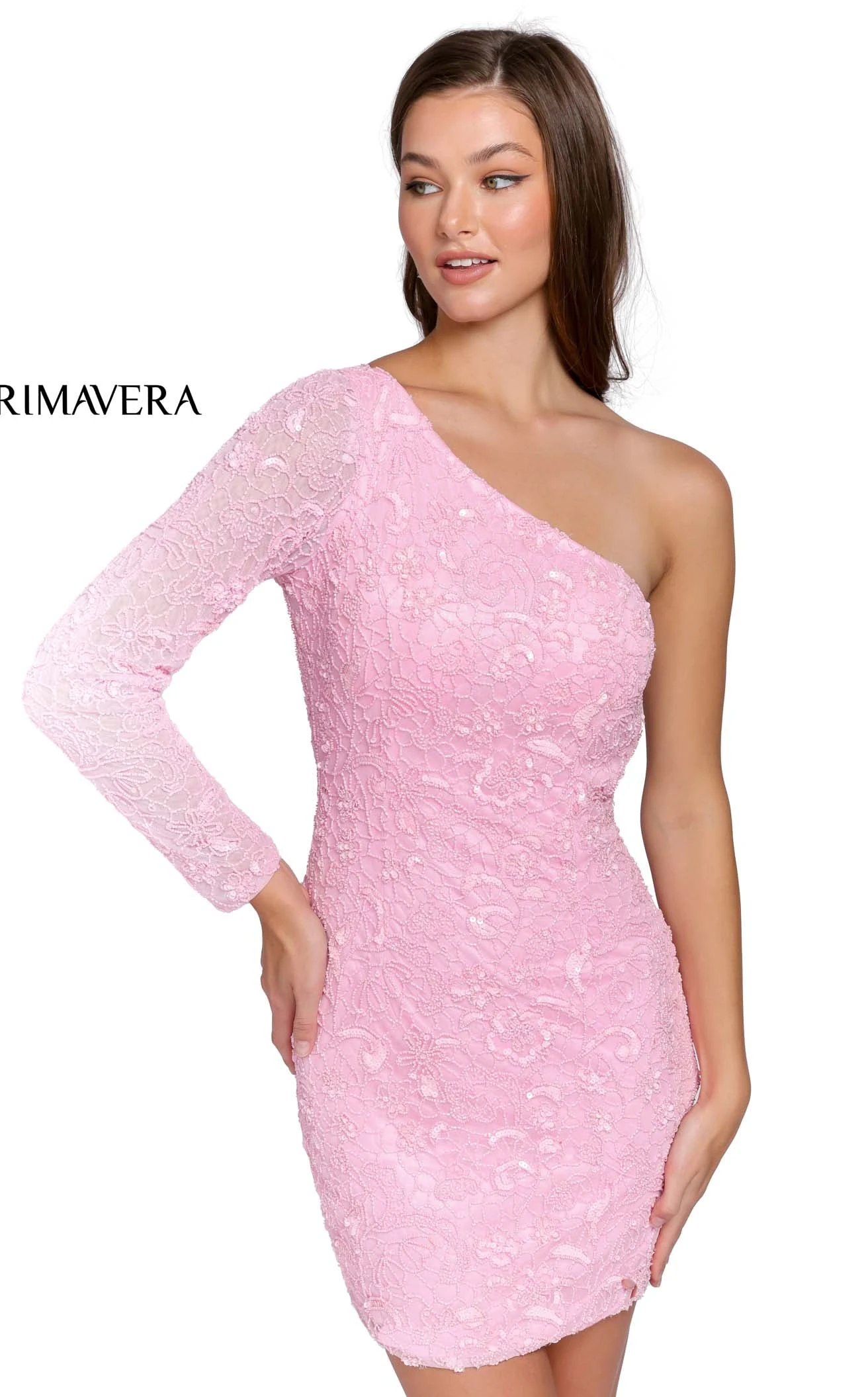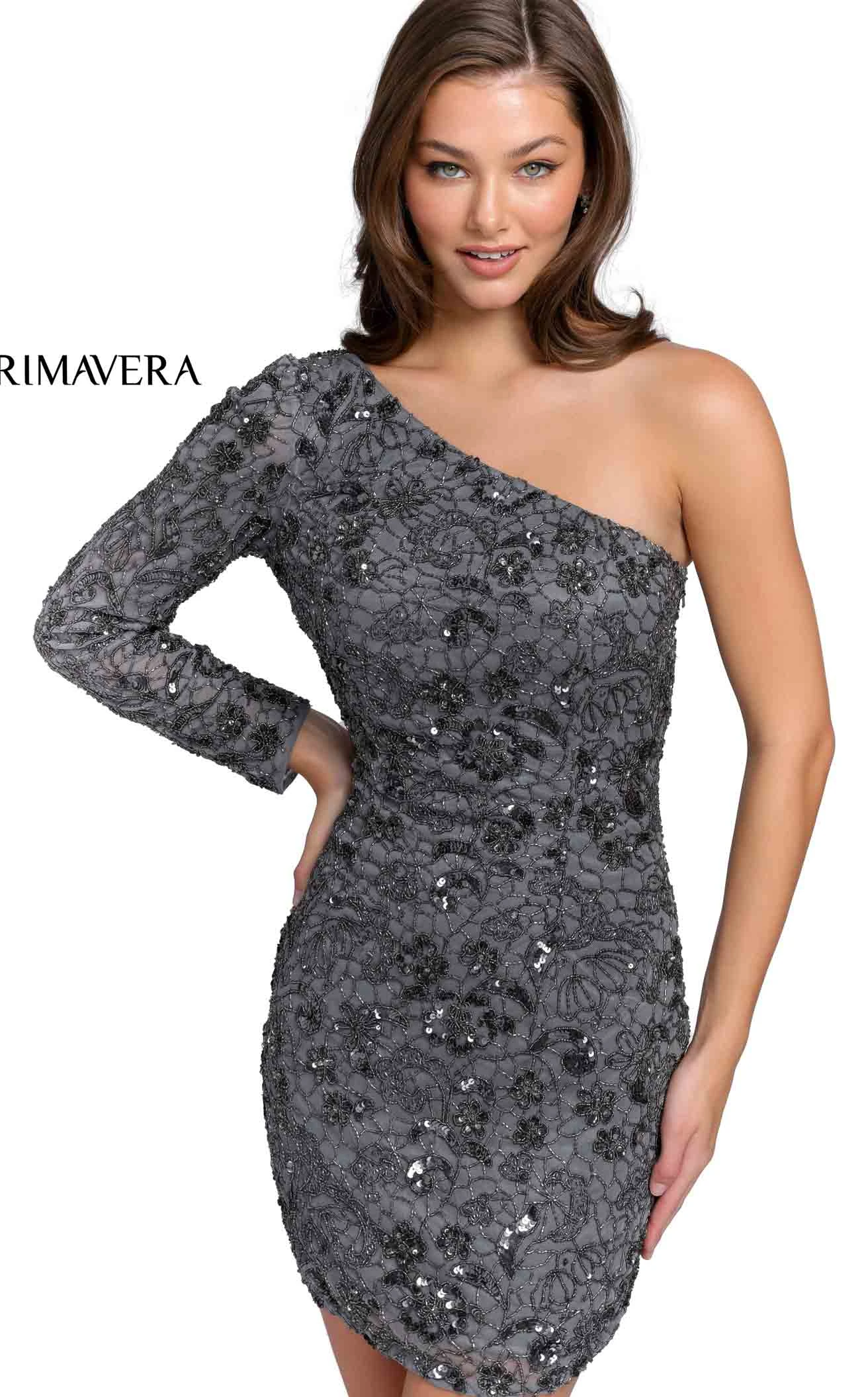 Wear this stunning short dress from Primavera Couture 3865 to be the best dressed. The fitted silhouette is adorned with detailed sparkles that shine brilliantly. The captivating asymmetrical neckline flows gracefully into a long fitted sleeve, which is finished with a supportive back strap. A delicate long sleeve asymmetrical neckline dress with a sheer overlay of beadwork is the perfect outfit for any formal event.