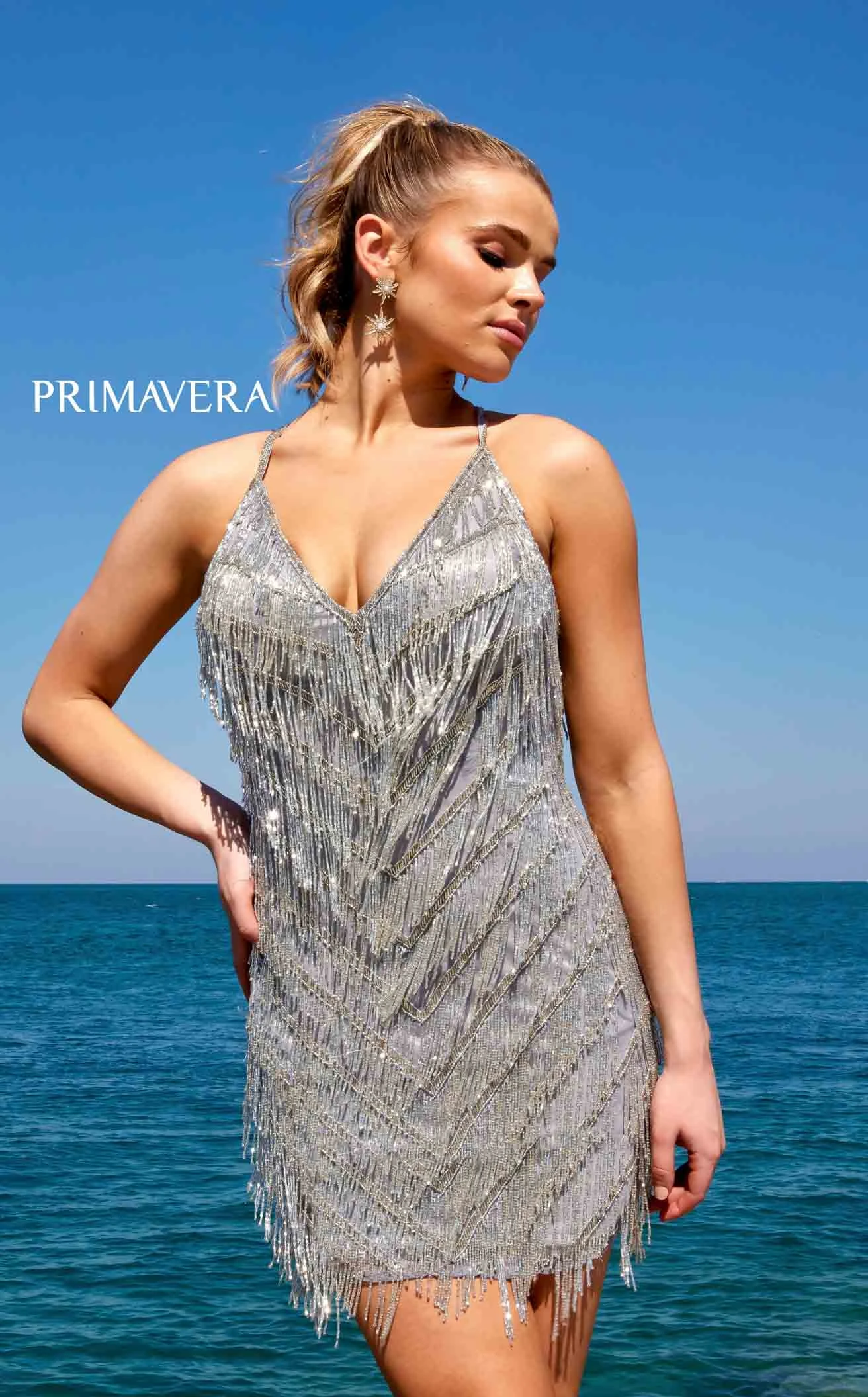 Experience the perfect harmony of comfort and glamor with the all-new 4019 Primavera Couture mini dress, a true wardrobe essential for every modern woman. The deep V-neckline and lace-up closure at the back give it a ravishing touch, and the spaghetti straps accentuate your collarbones. The bodycon dress is entirely covered in sequins and fringes that add to its flair.