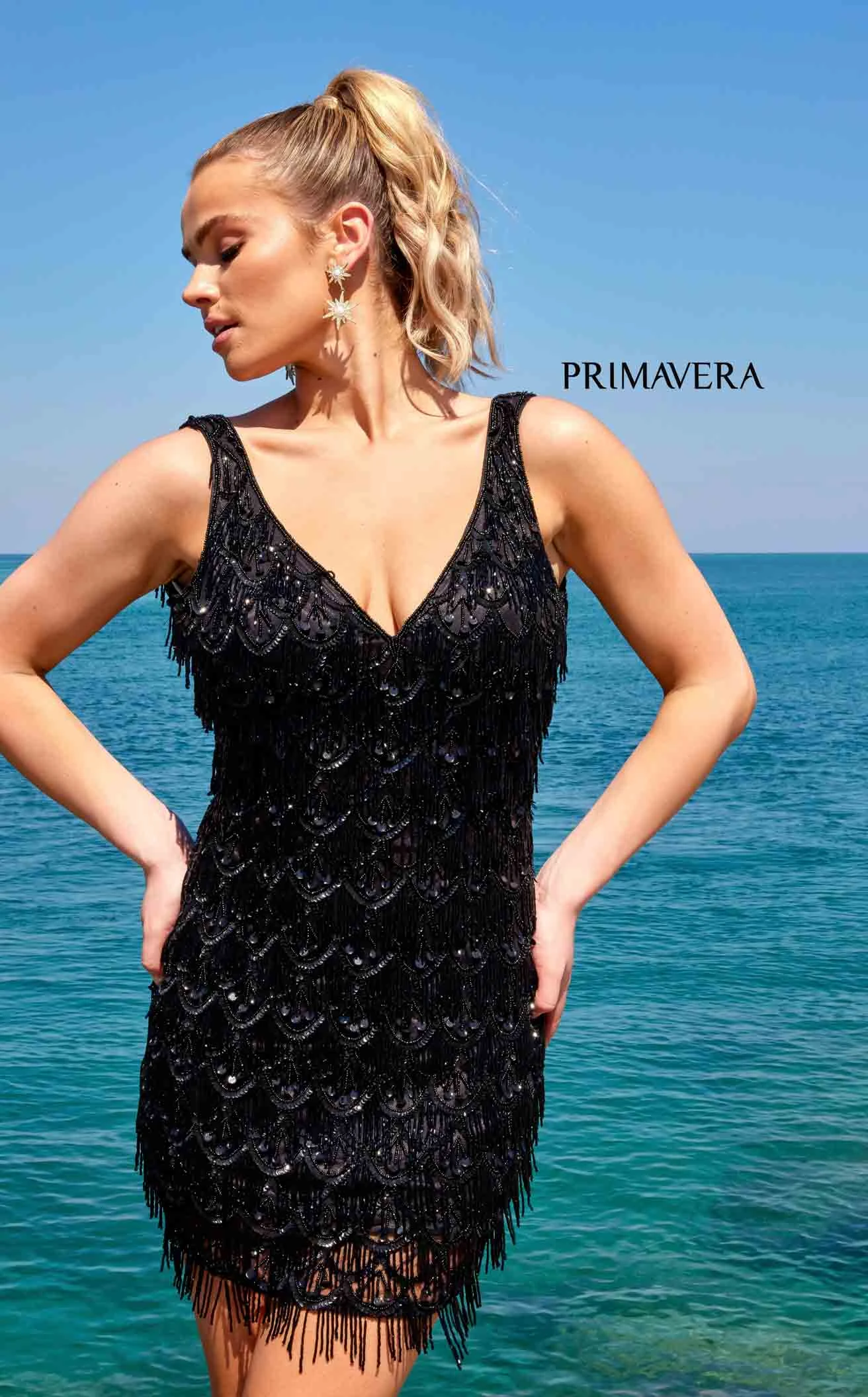 Plunging V-neckline Beaded Fringe Short Dress by Primavera Couture