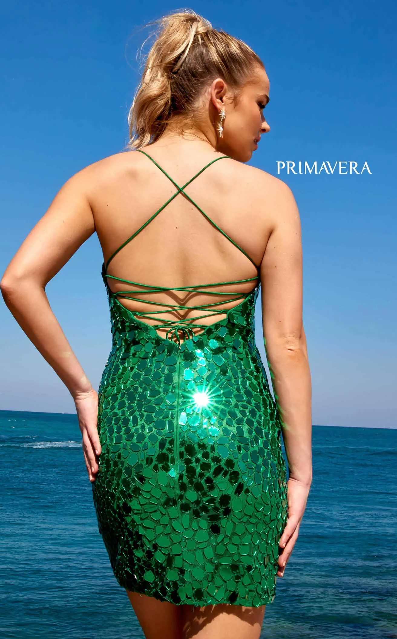Inspire envy and admiration wherever you go in the mesmerizing 4056 Primavera Couture short dress, a true statement of refined elegance. The plunging V-neckline gracefully enhances your décolletage, adding a touch of sensuality to your look. The slender spaghetti straps not only exude delicacy but also ensure a secure and comfortable fit. The true show-stopper of this dress is the dazzling mirror work that adorns every inch of its surface.