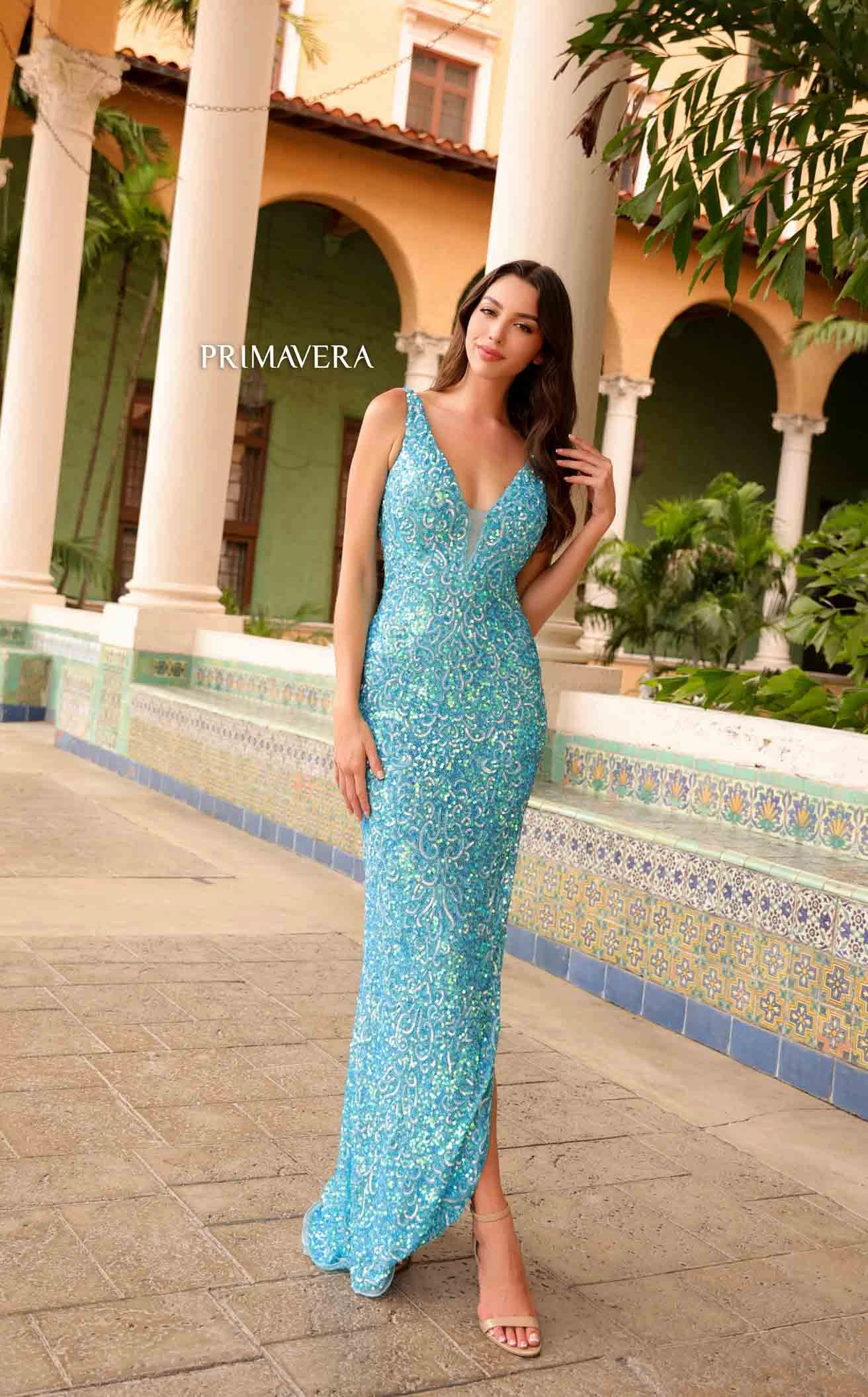 Flaunt the fashioned delight in your breathtaking look wearing the Primavera Couture 4104 dress. It features a sequin-stretch fabrication with intricate embroidery details throughout. With a plunging mesh V-neckline, the dress has a flattering sheath silhouette. It has a circle thigh-high slit from the side and a deep V construction on the open back.