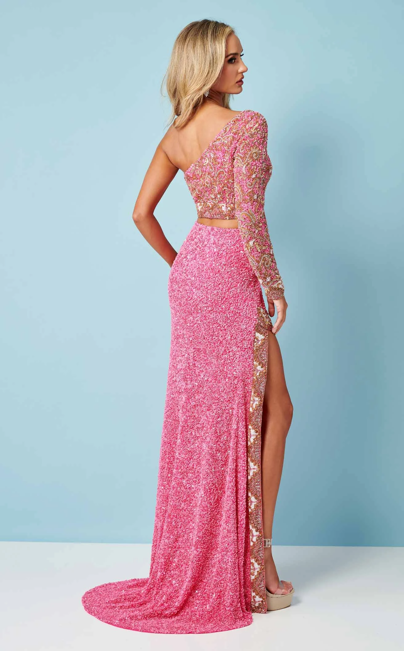 With this gorgeous work by Rachel Allan 70331, you can assert your position as the diva of the evening. It comprises an asymmetrical crop top mixed with a one-shoulder long sleeve ornamented with finely patterned beading, a fitted bodice, and a skirt that is lavishly embroidered with magnificent beads and textured sequins all around. The skirt has a high slit and finishes with a sweep train.