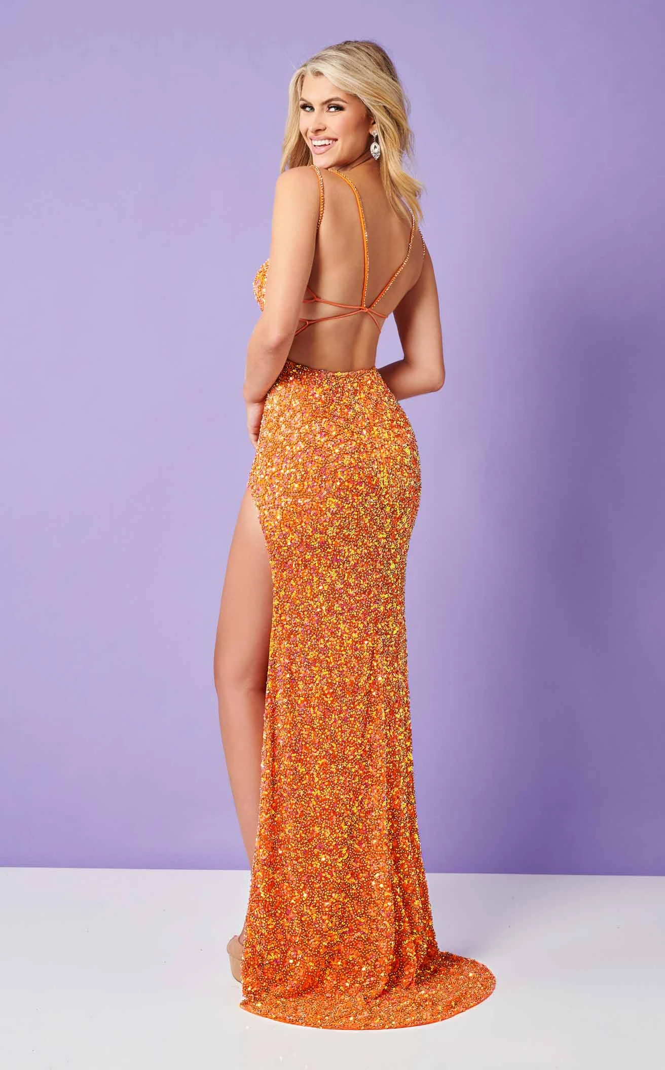 Listen to your heart and get this lovely dress designed by Rachel Allan 70373 to flaunt your figure. The dual spaghetti beaded straps hold the dress from the shoulder and highlight a square neckline on a fitted bodice. To make the dress appealing it is appliqued with beaded lace and features a straight-line skirt that touches the floor that manifests a high-slit cut and a sweep train.