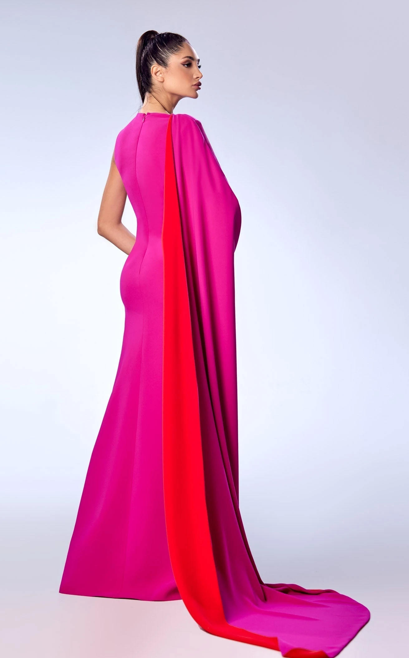 Make your party days and nights a lot more fun by wearing this two-toned dress designed by Reverie Couture FW53. It has a high neckline with a long sleeve on one side and a sleeveless design on the other. The fitted bodice showcases a classic sheath figure and has a diagonal high-slit opening. It has an attached cape that flows down to form a sweep train.