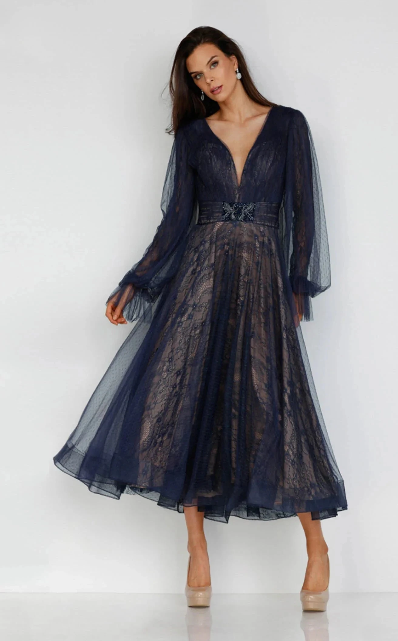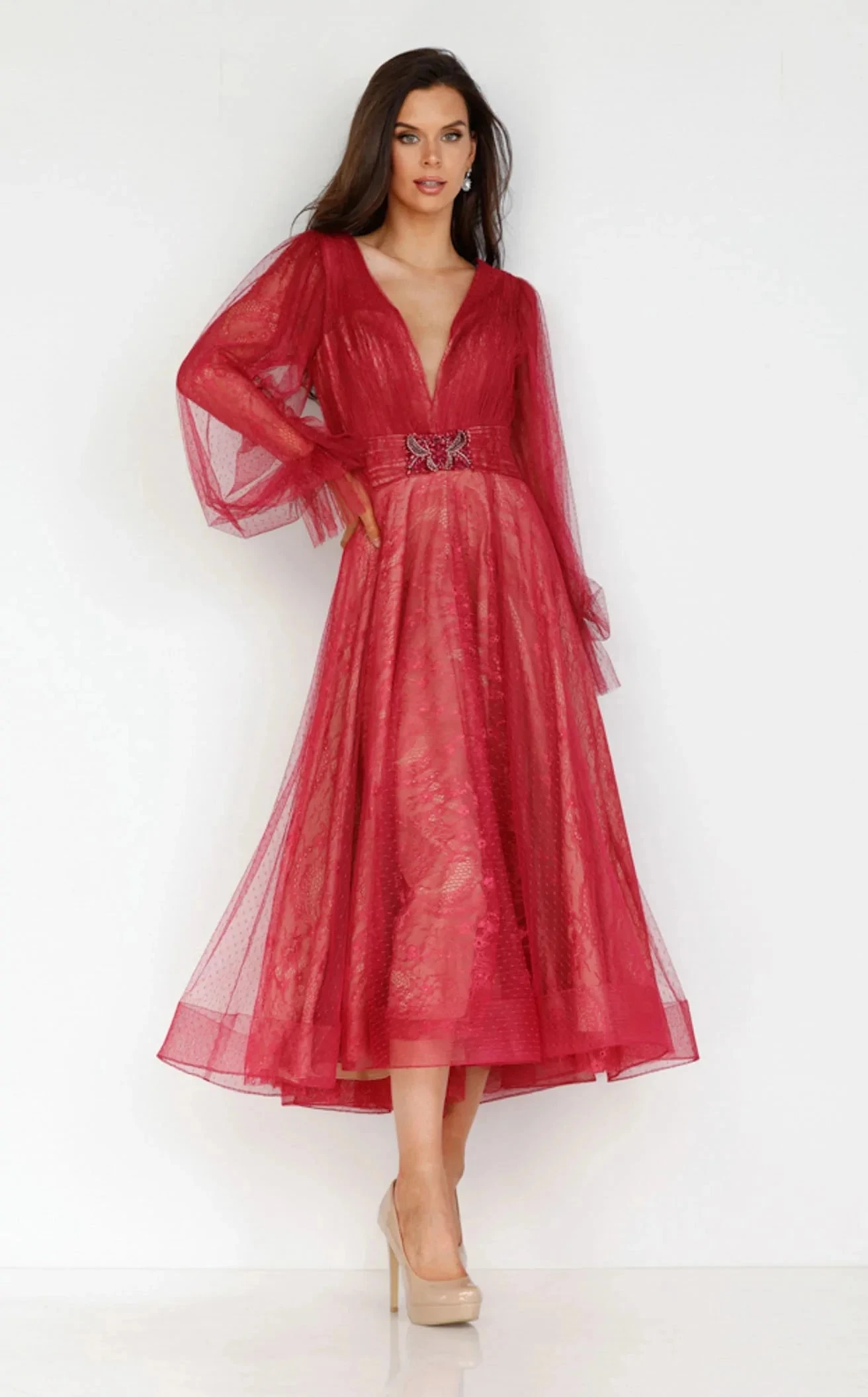 Greet your guests in this classic lace gown designed by Terani 231C0224. The dress features a plunging neckline and fitted bodice that is attached to puffy, structured long sleeves and also reveals a wide belt wrapped over the waistline. A-line pleated silhouette flares and ends below the knees.
