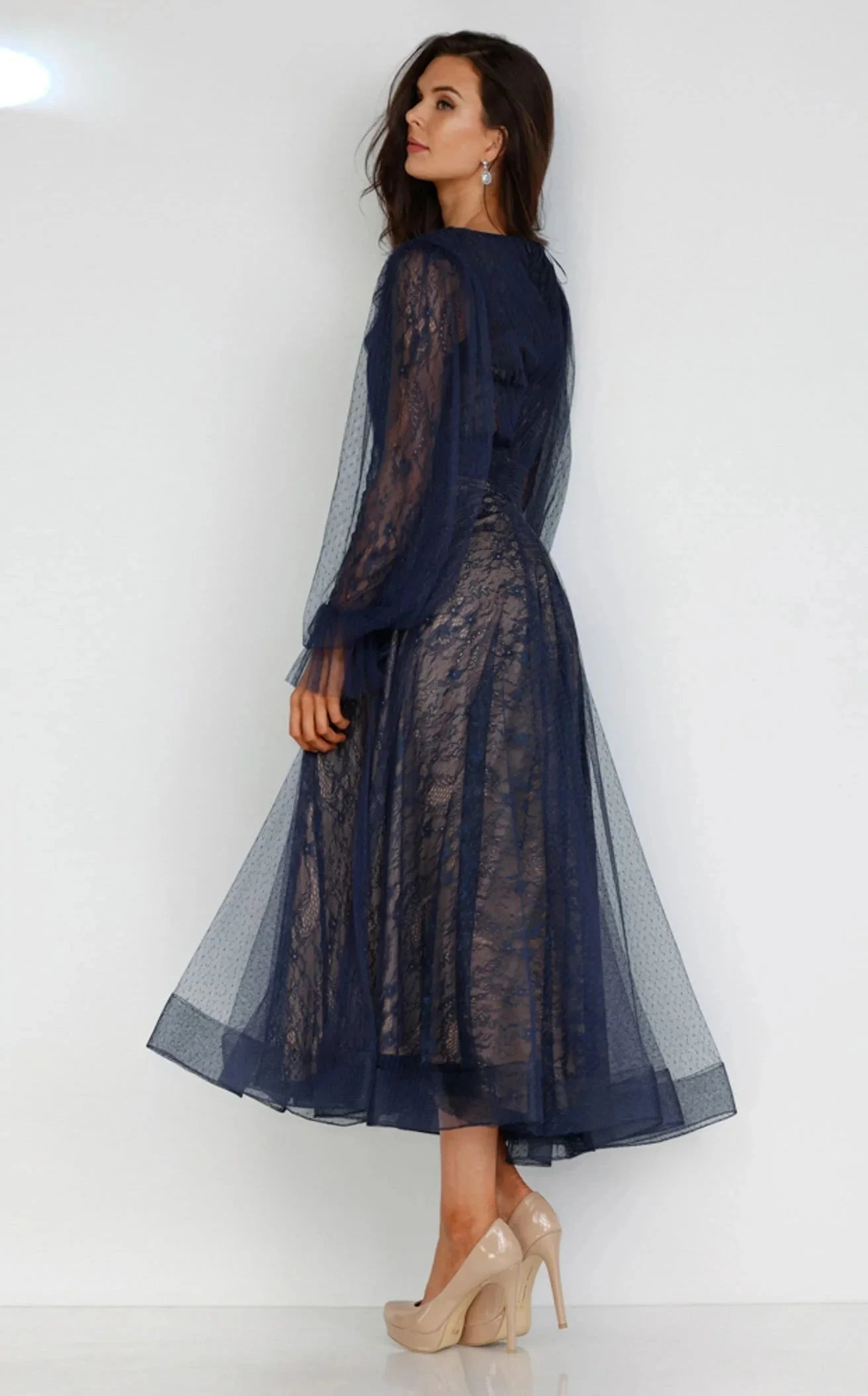 Flirtatious Full Sleeves Double-layered Lace A-line Long Dress by Terani