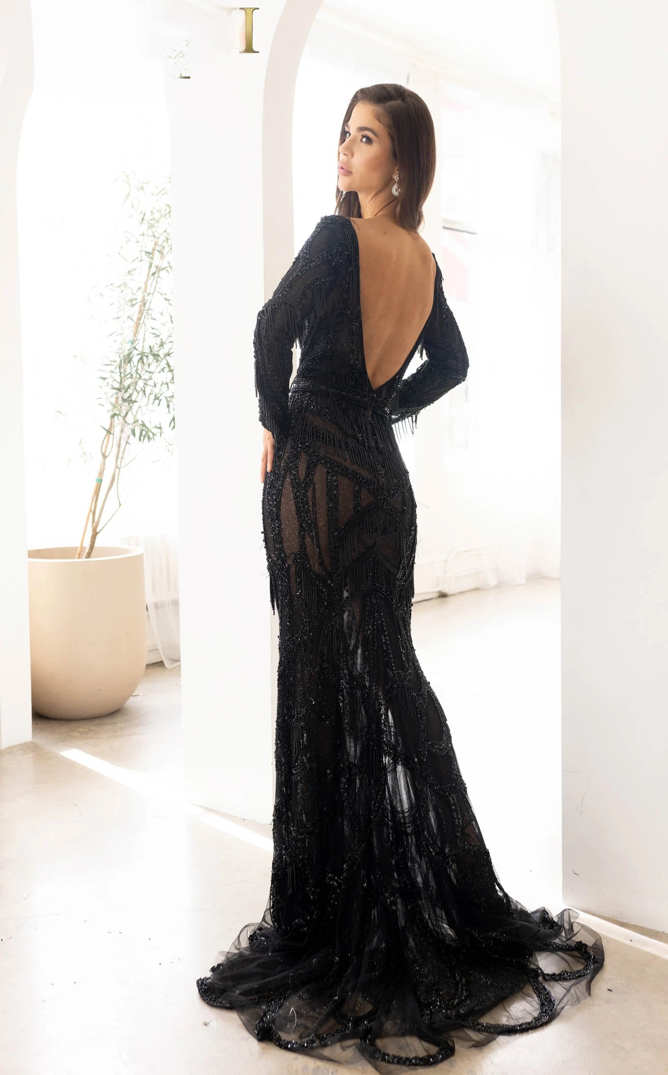 Head for a memorable evening in this 241GL2610 Terani long dress. The fitted bodice has a boat neckline, full sleeves with fringes, and a deep back. Its natural waistline features a sleek fabric belt and the trumpet skirt has a sheer detailing. Enveloped in sequin embroidery, this flowy outfit adds to the bling effect. It ends with a sweep train, giving you the perfect opportunity to make a statement.